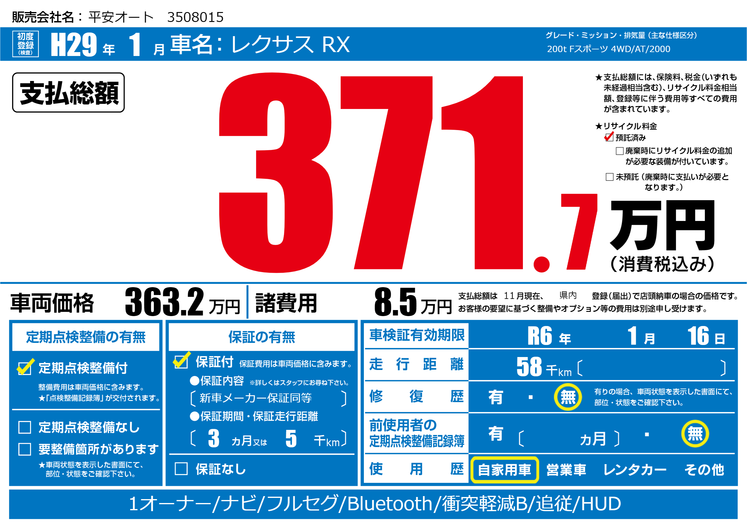 | 車名 | レクサス RX | グレード ミッション 排気量 |