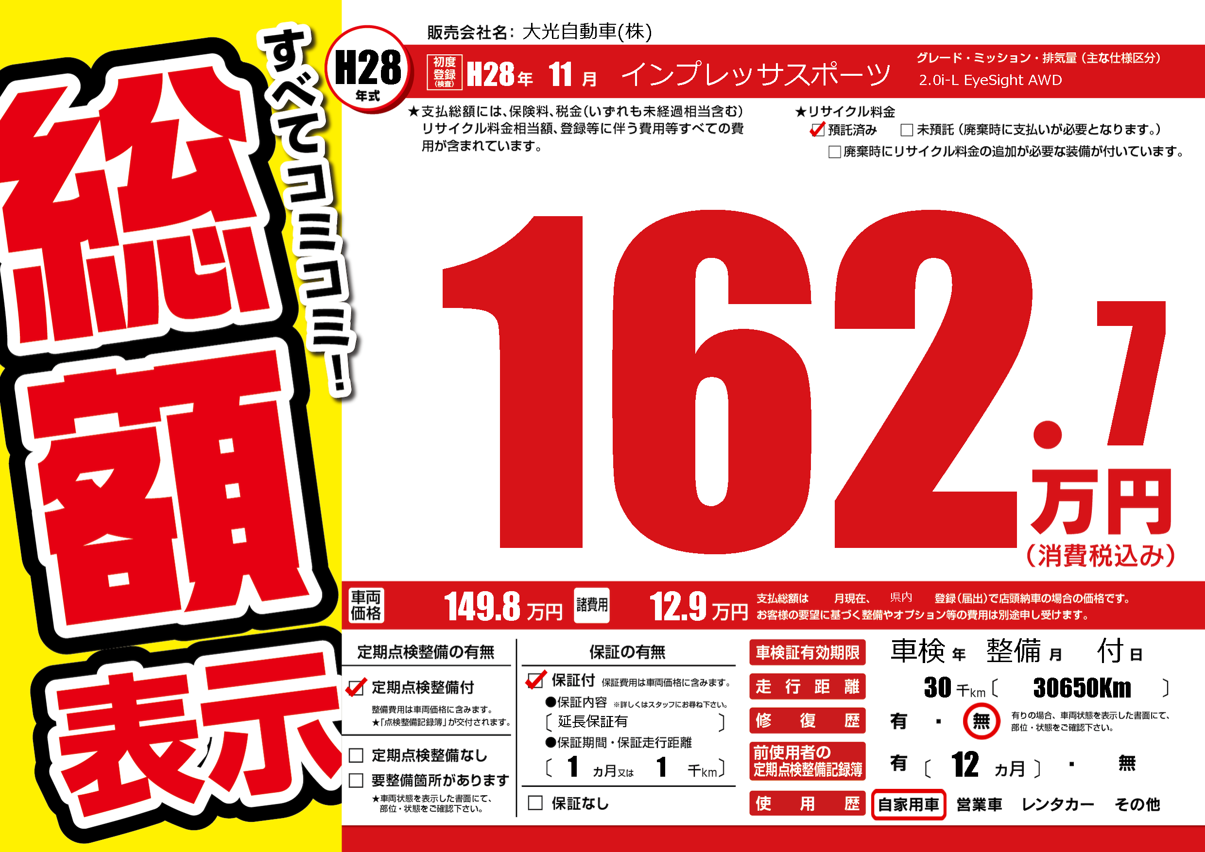 | 車名 | インプレッサスポーツ | グレード ミッション 排気量 |