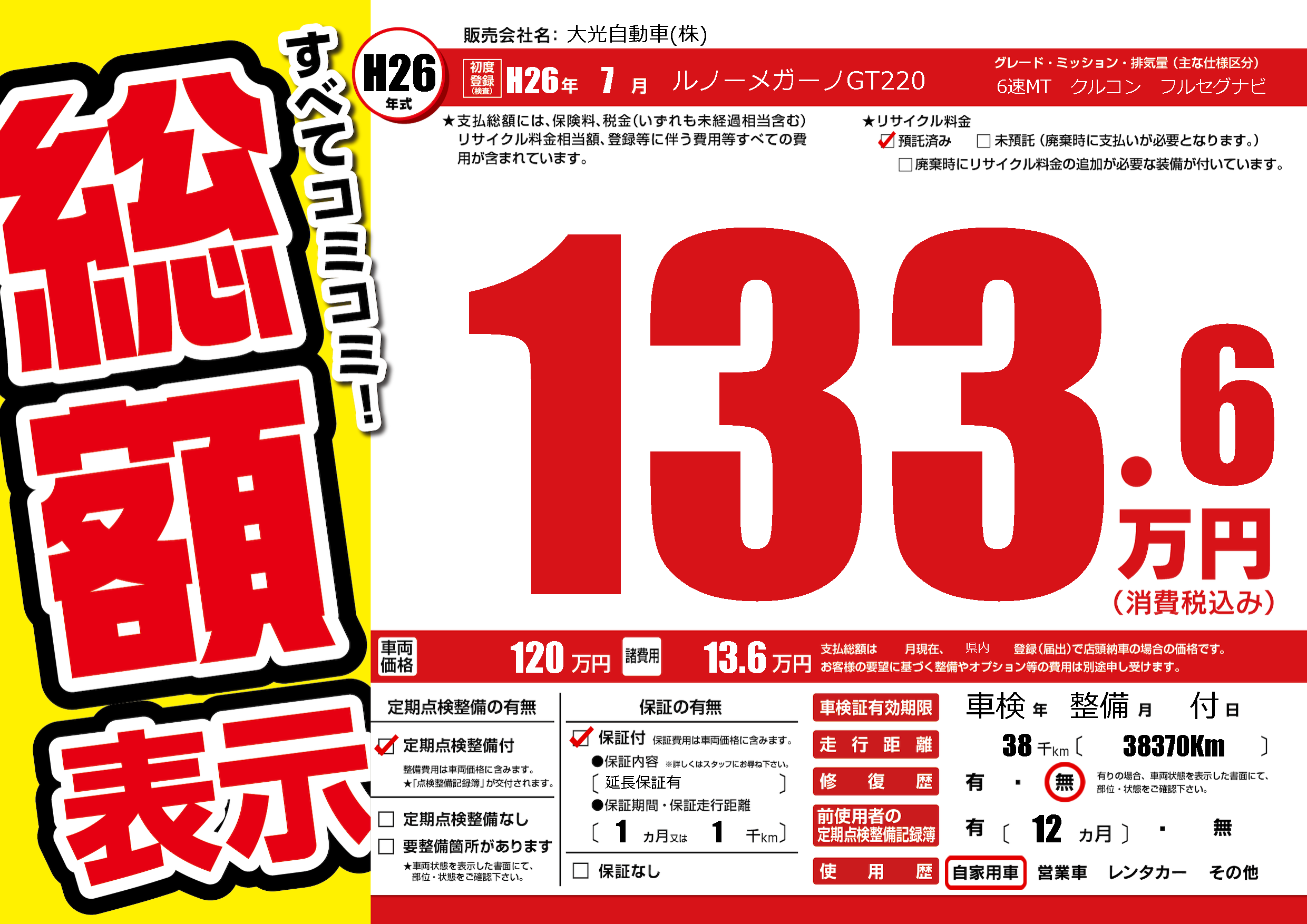 | 走行キロ | 3.8万km | 初年度登録 | H26年7月 |