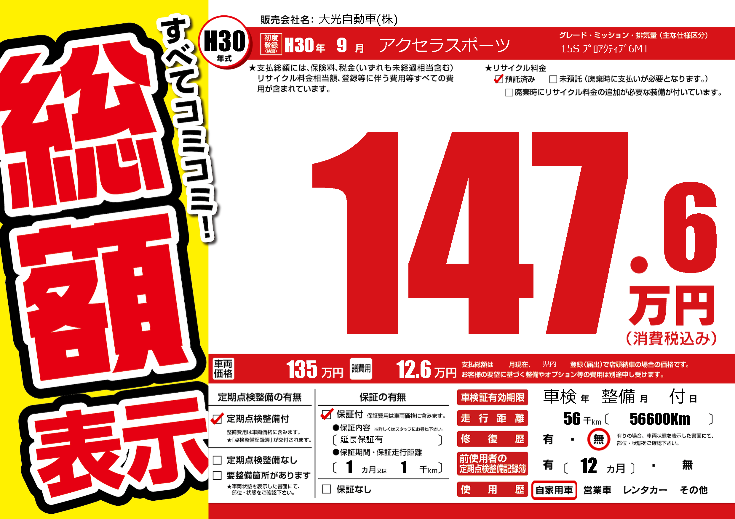 | 走行キロ | 5.6万km | 初年度登録 | H30年9月 |