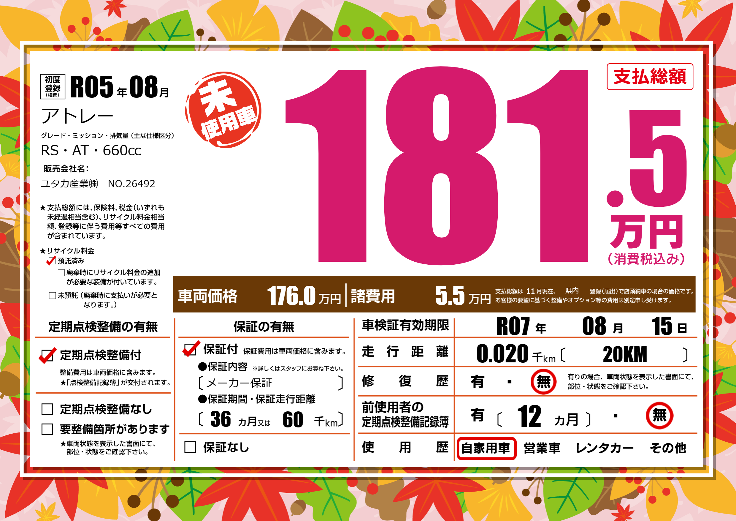 | 走行キロ | - | 初年度登録 | R05年08月 |