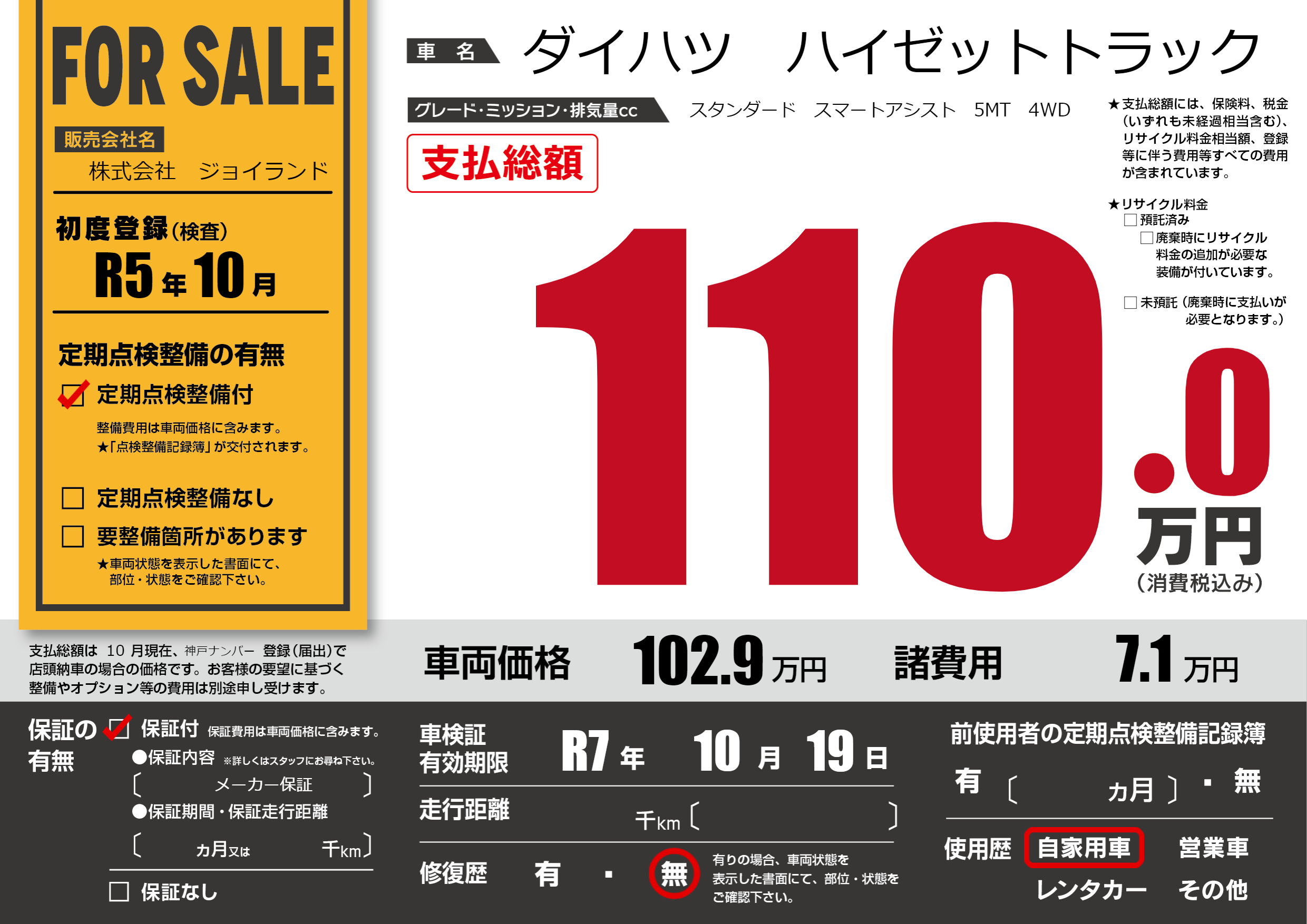 保証付き 保証内容( メーカー保証) ---ヶ月または()千kmまで |