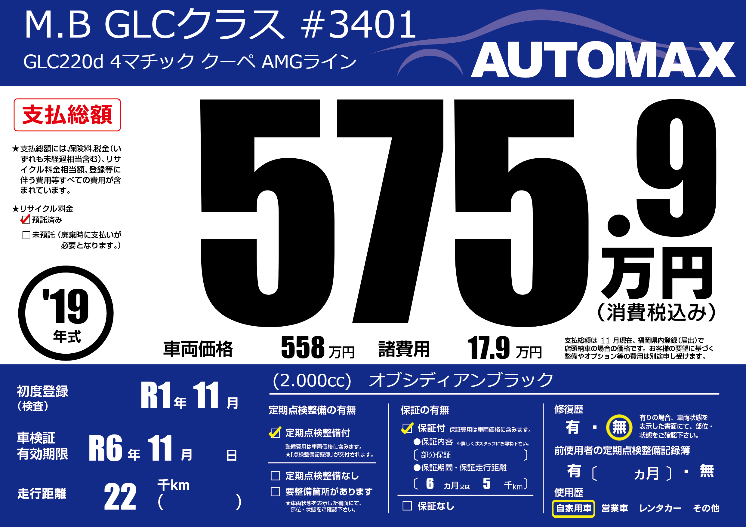 | 車名 | M.B GLCクラス #3401 | グレード ミッション 排気量 |