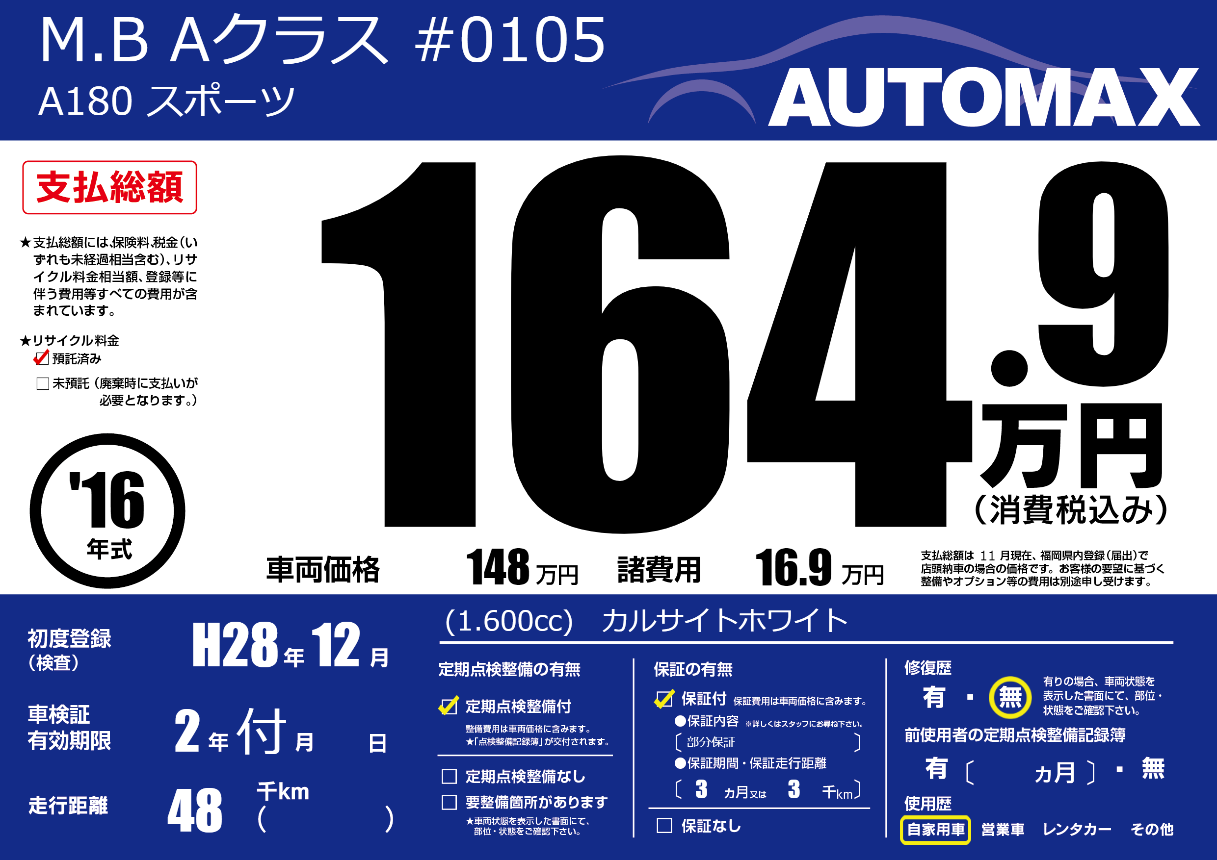 | 車名 | M.B Aクラス #0105 | グレード ミッション 排気量 |