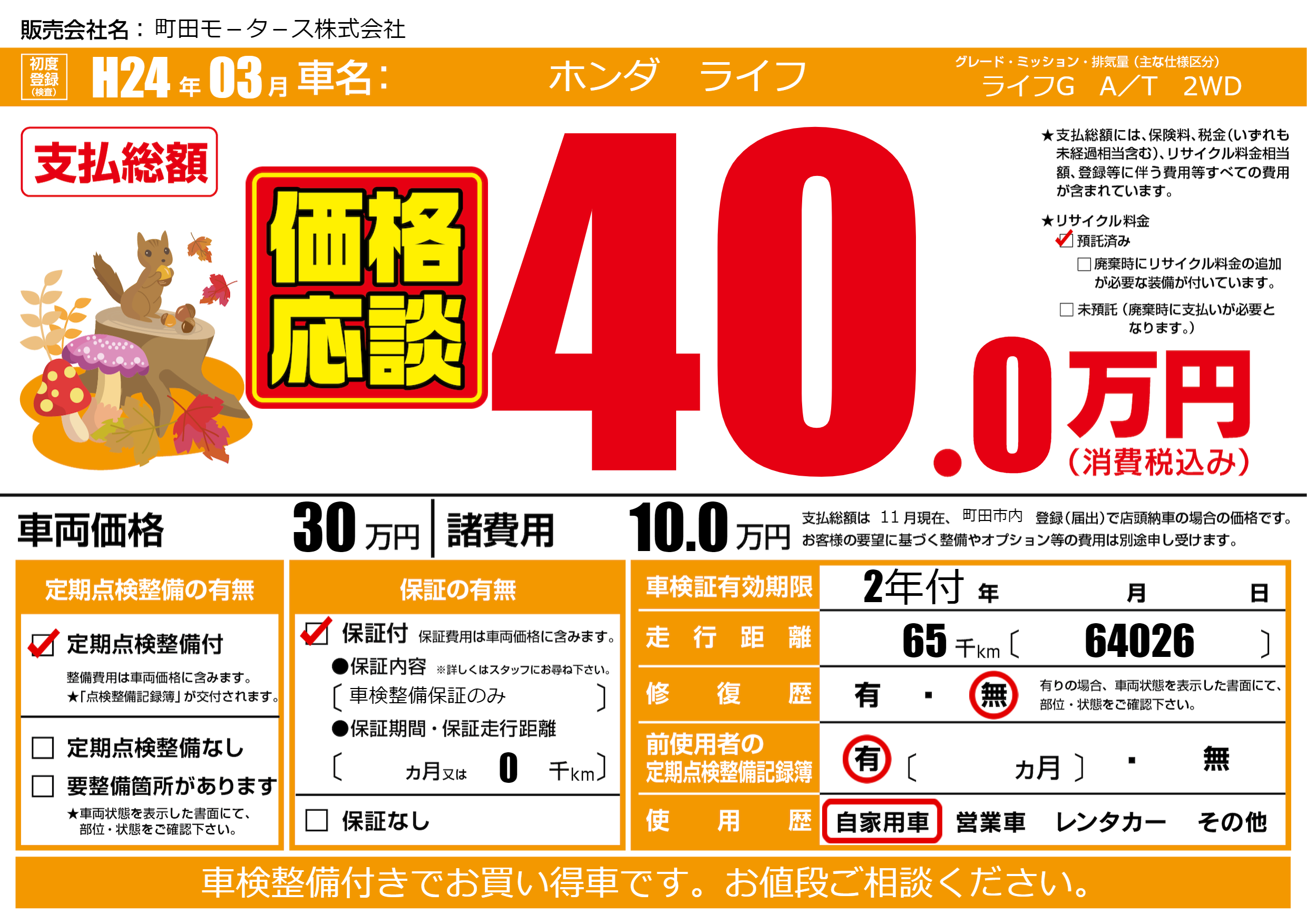 | 車名 | ホンダ ライフ | グレード ミッション 排気量 |