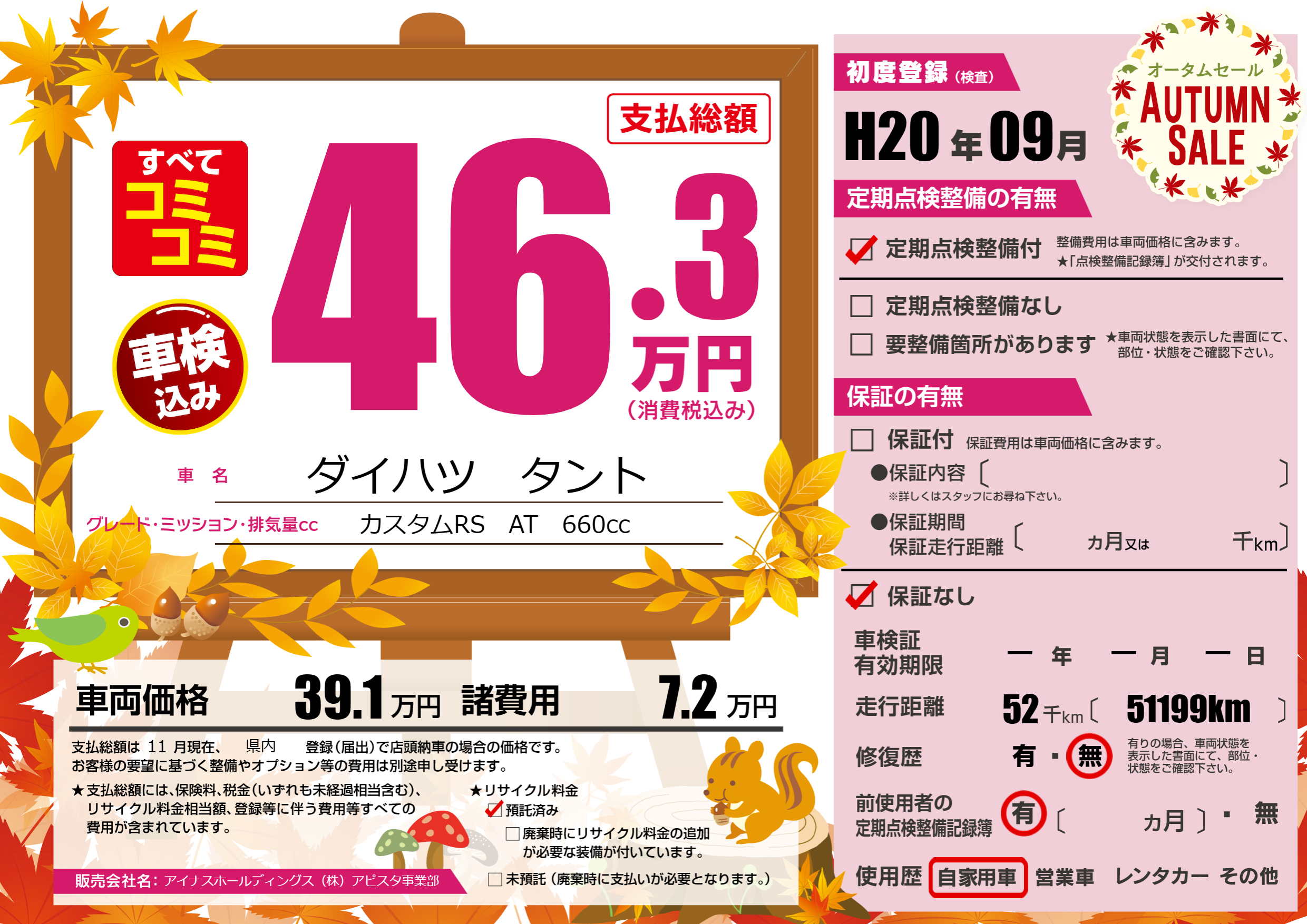 | 車名 | ダイハツ タント | グレード ミッション 排気量 |