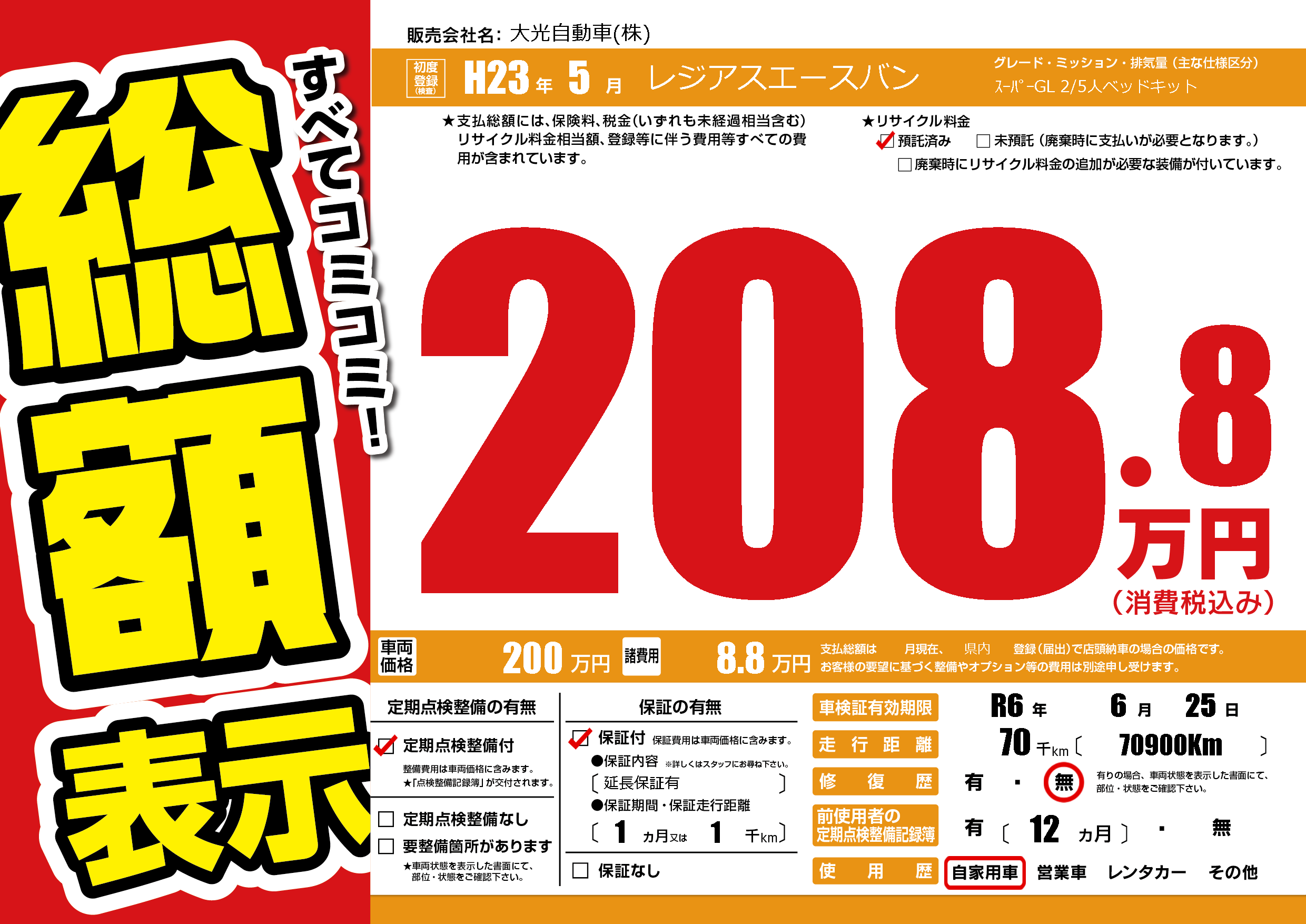 | 走行キロ | 7万km | 初年度登録 | H23年5月 |