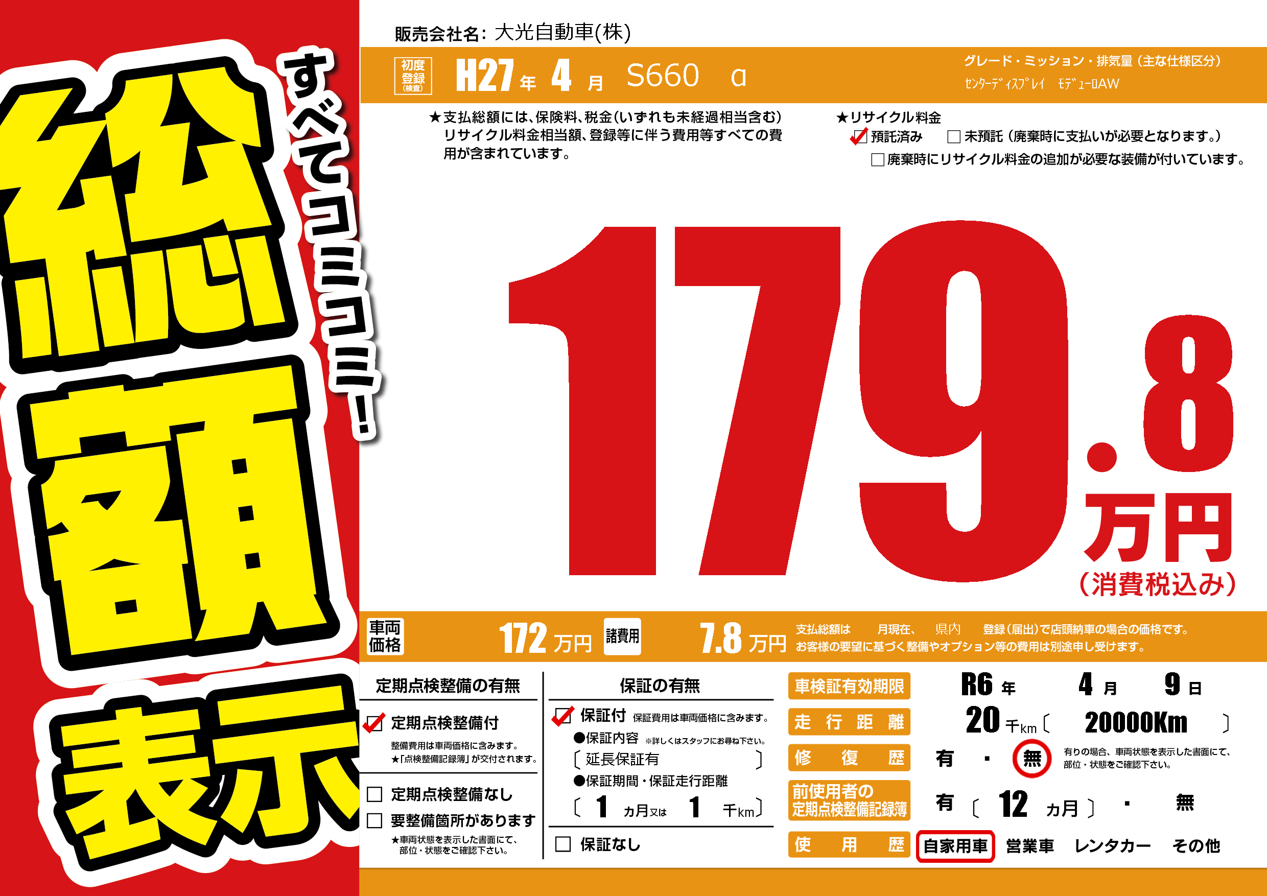 | 車名 | S660 α | グレード ミッション 排気量 |
