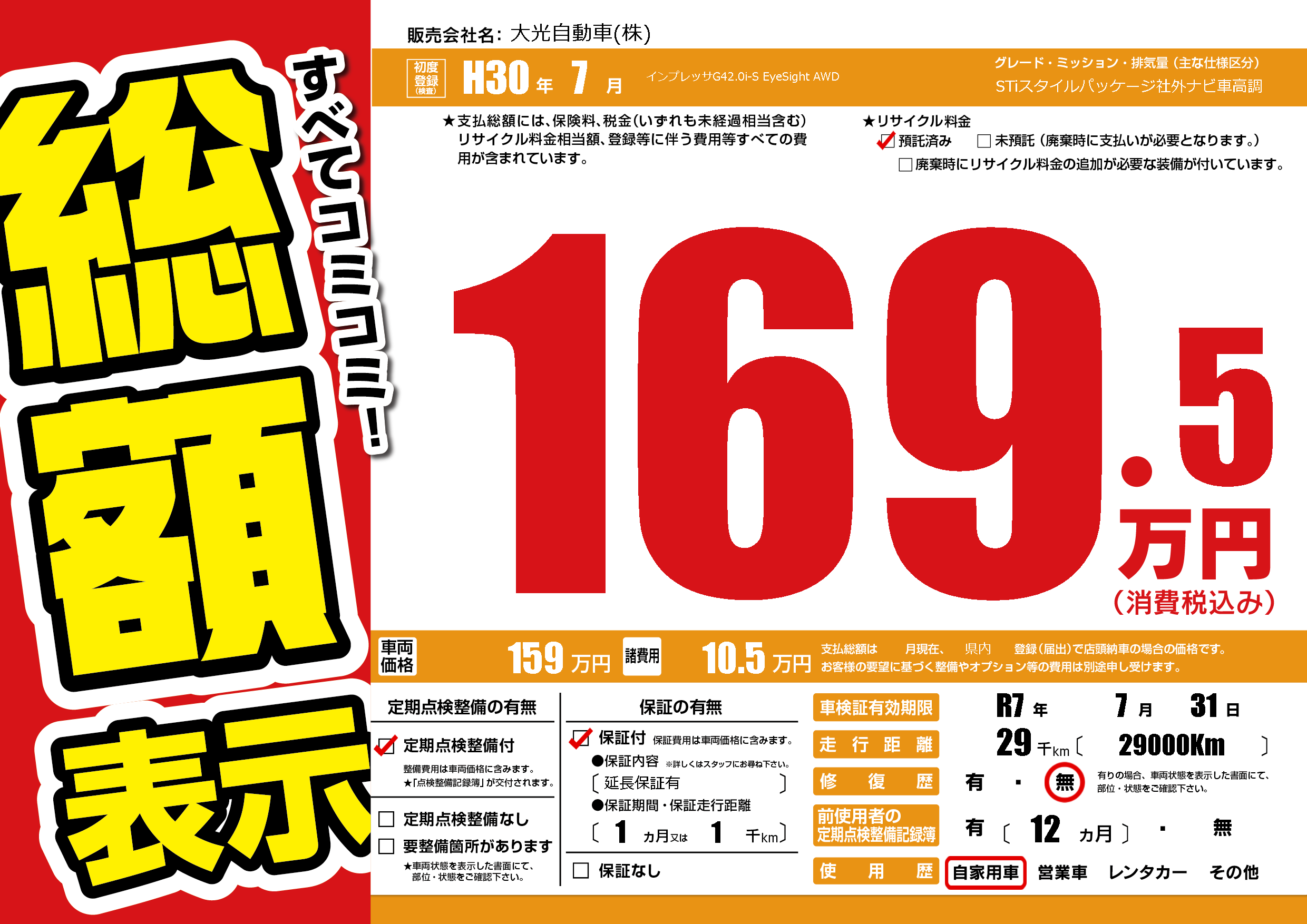 | 車名 | インプレッサG42.0i-S EyeSight AWD | グレード ミッション 排気量 |