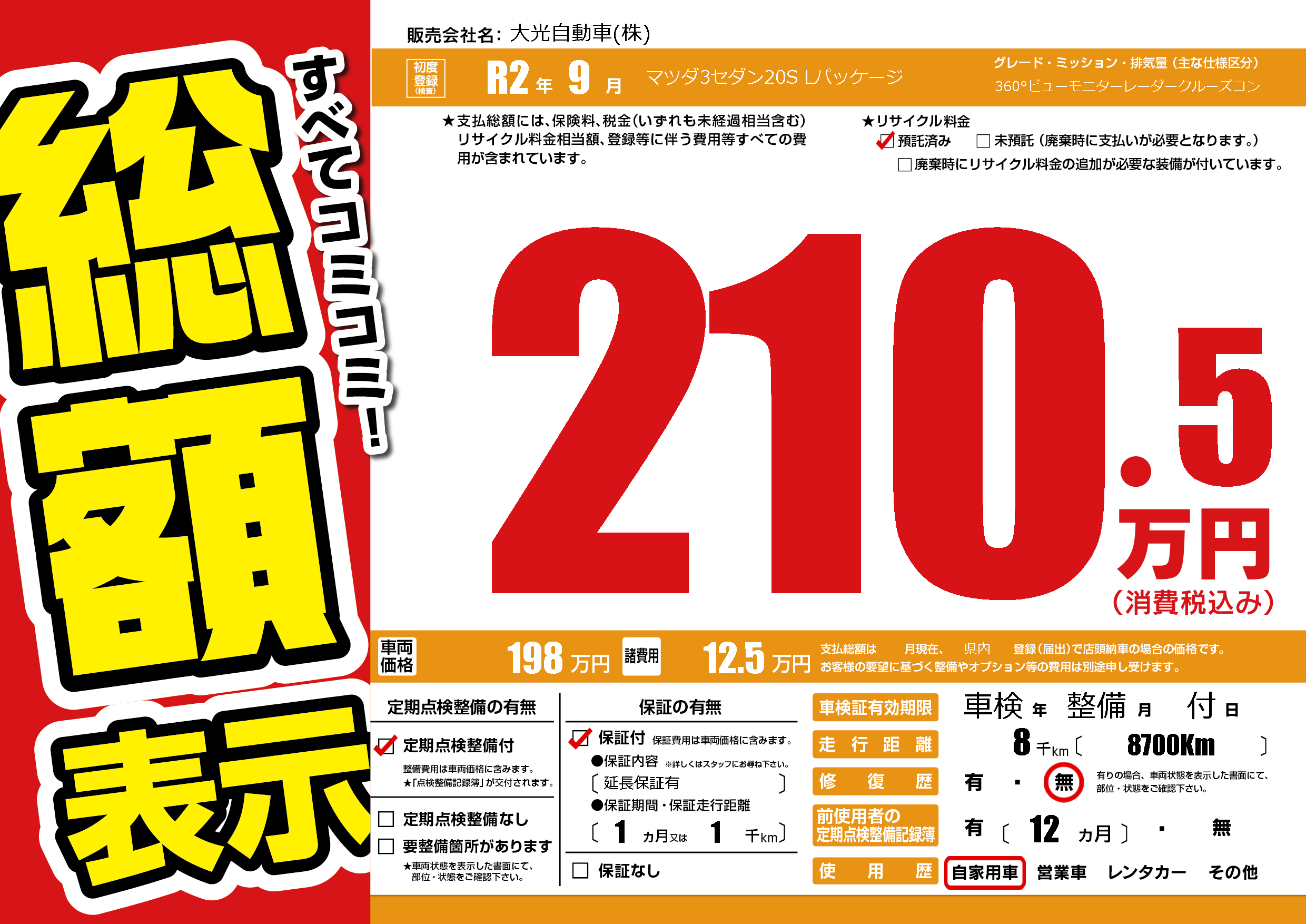| 車名 | マツダ3セダン20S Lパッケージ | グレード ミッション 排気量 |