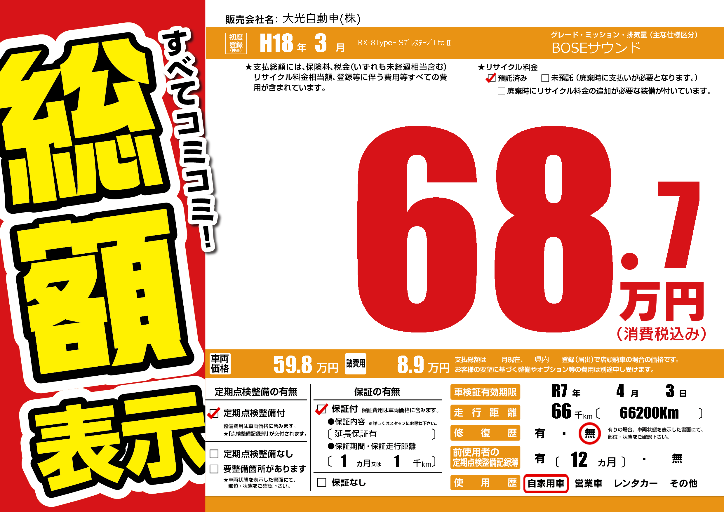 | 走行キロ | 6.6万km | 初年度登録 | H18年3月 |