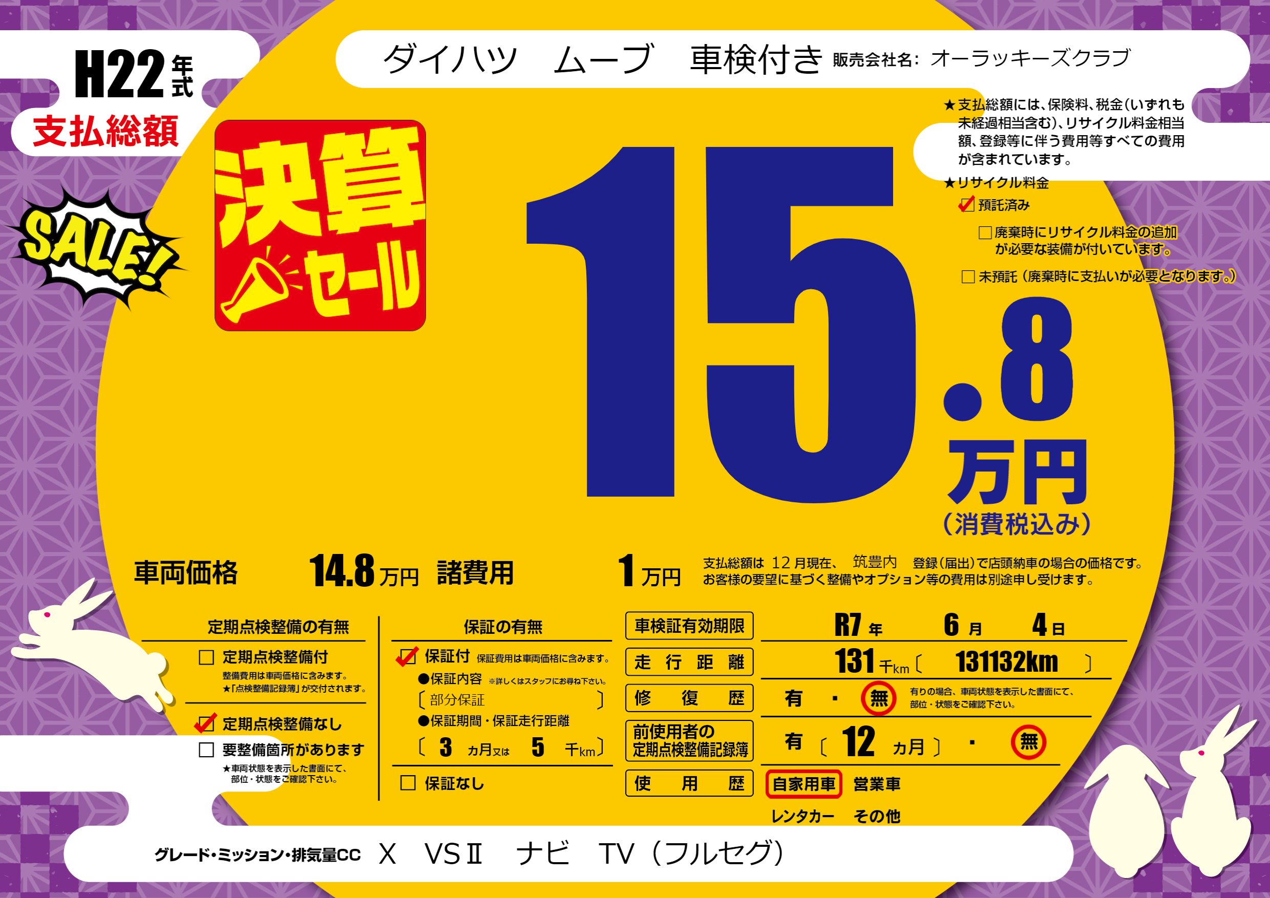 なし | 車検制限 | R7年6月4月 |