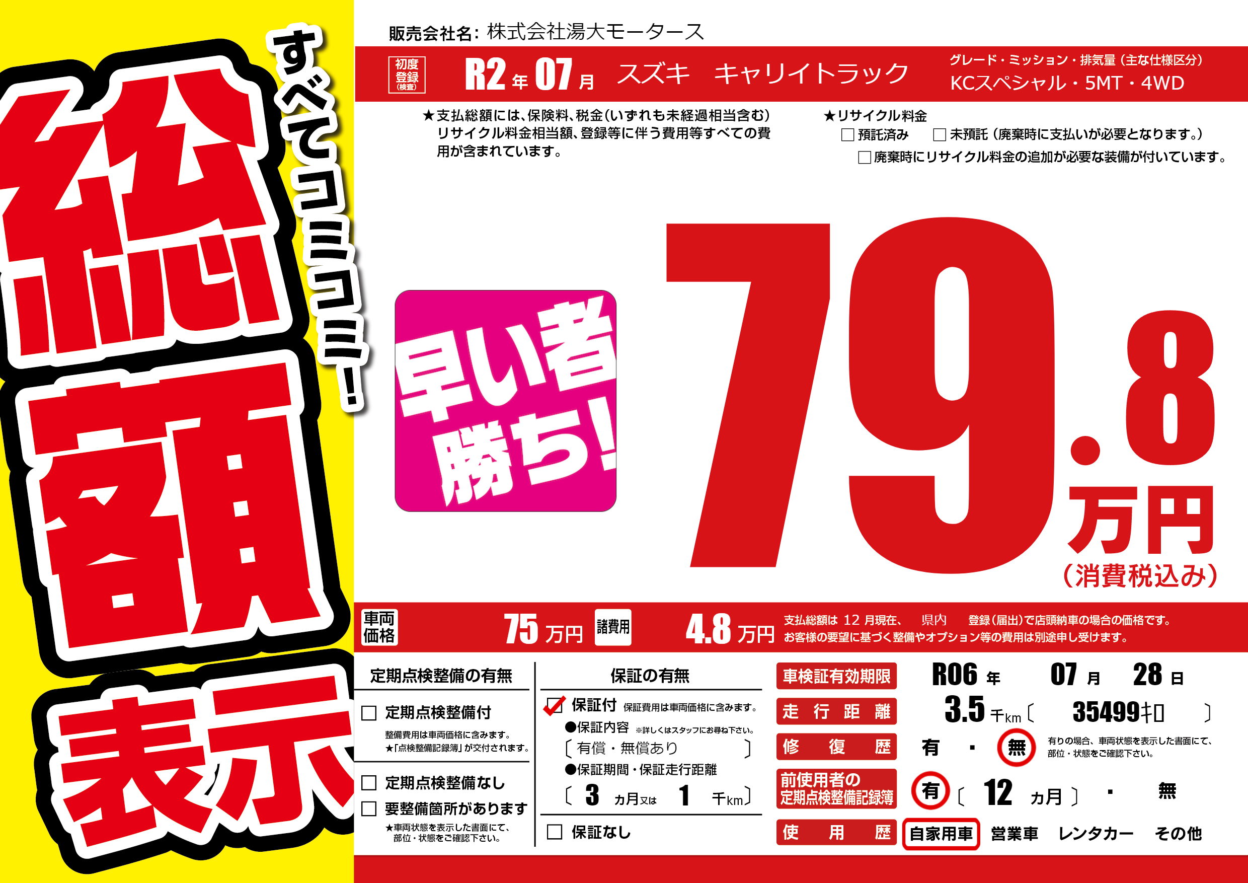 | 車名 | スズキ キャリイトラック | グレード ミッション 排気量 |