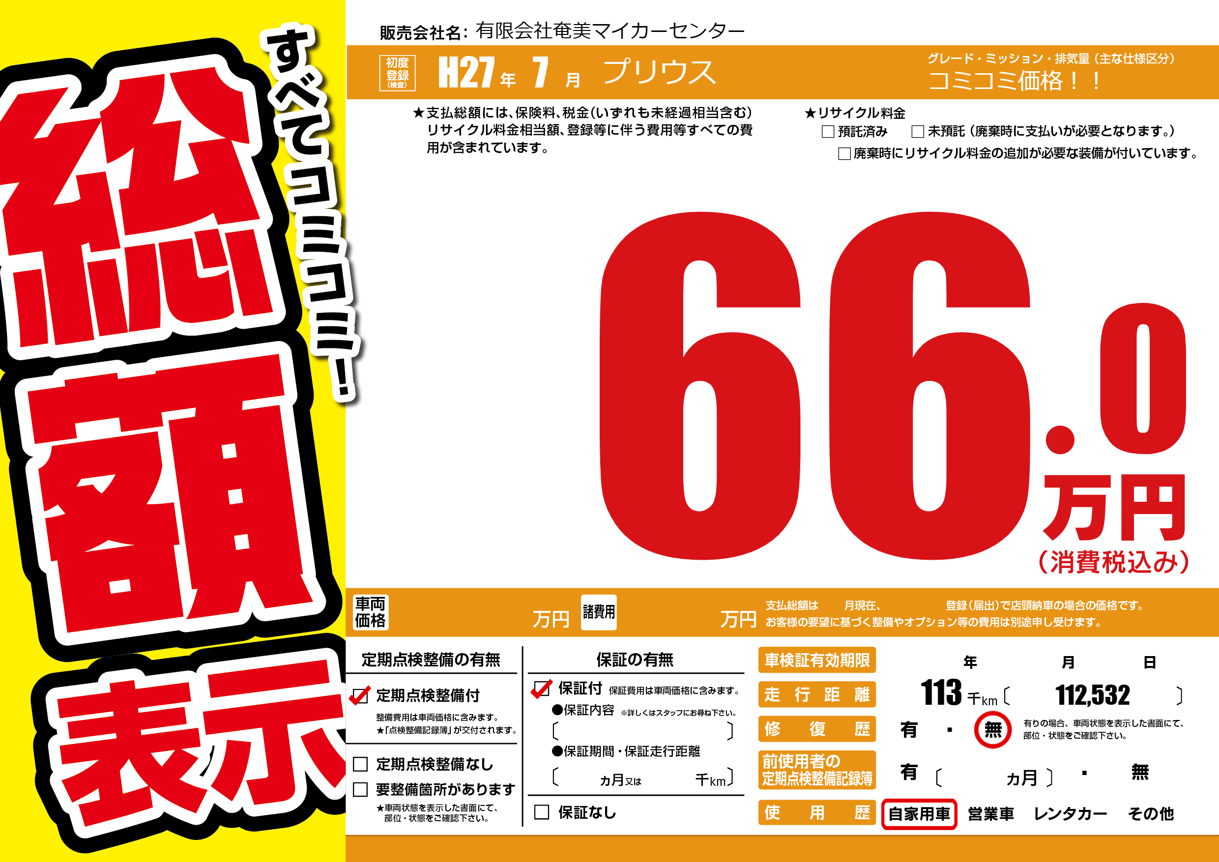 | 車名 | プリウス | グレード ミッション 排気量 |