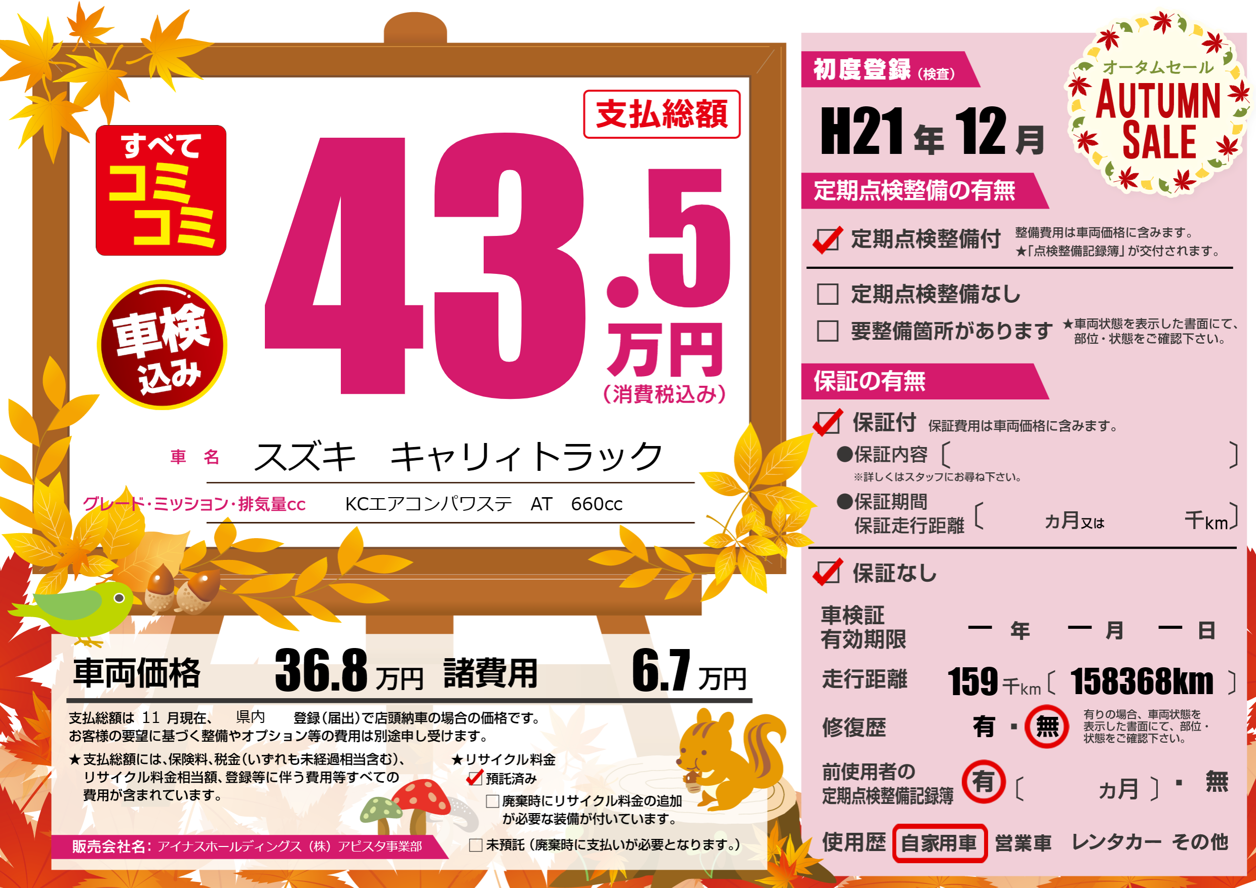 | 走行キロ | 15.9万km | 初年度登録 | H21年12月 |