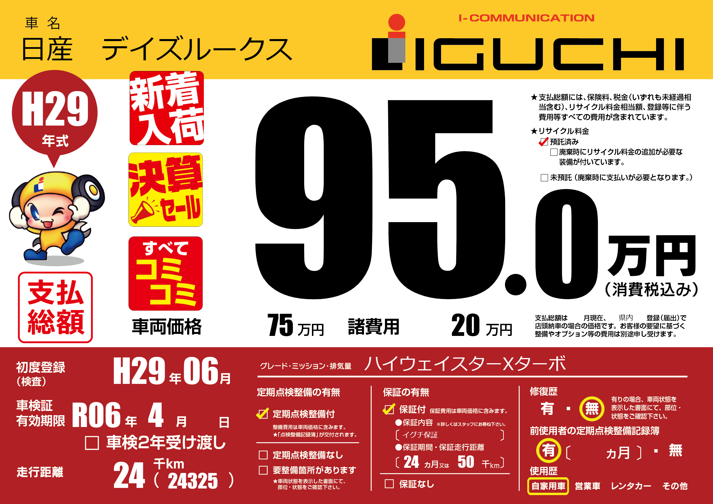 保証付き 保証内容(イグチ保証) 24ヶ月または(50)千kmまで |