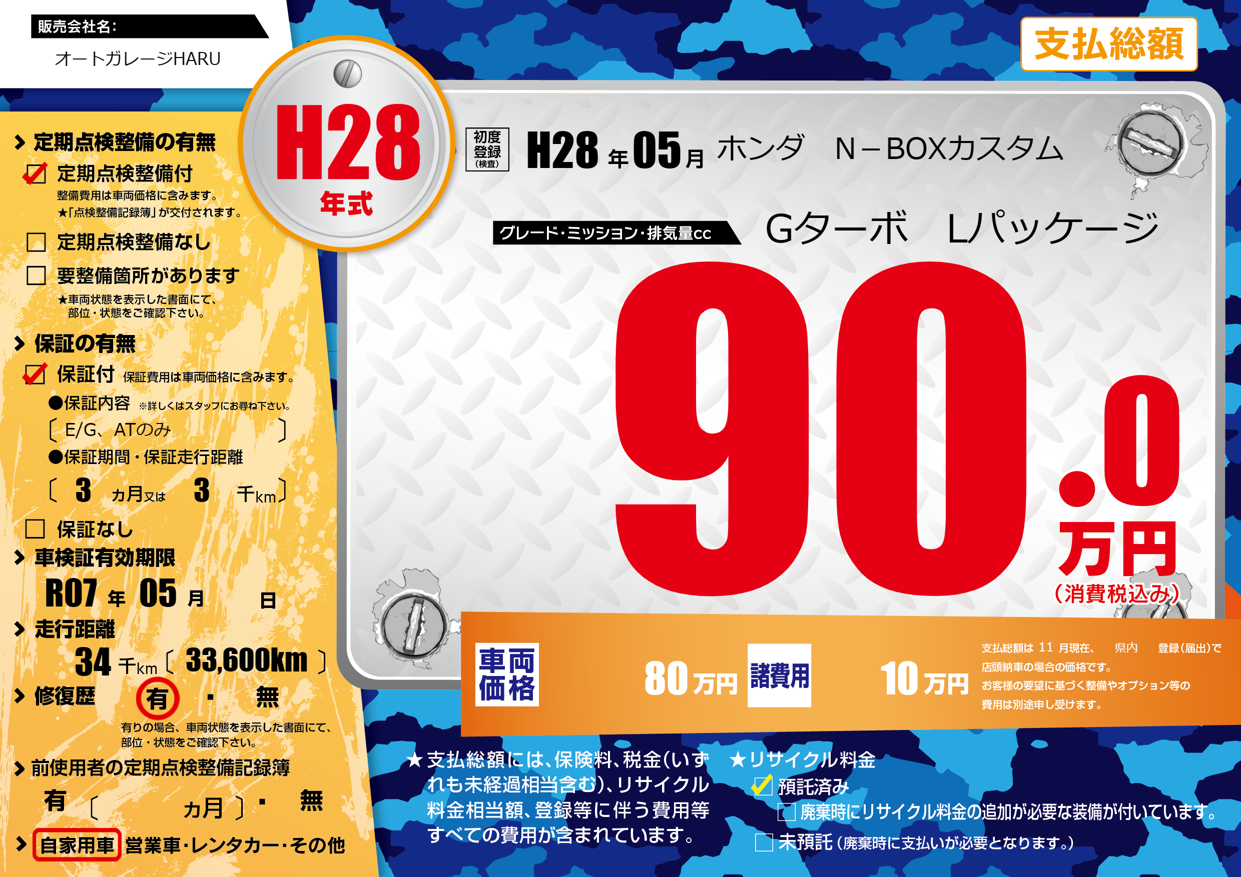 | 車名 | ホンダ N-BOXカスタム | グレード ミッション 排気量 |