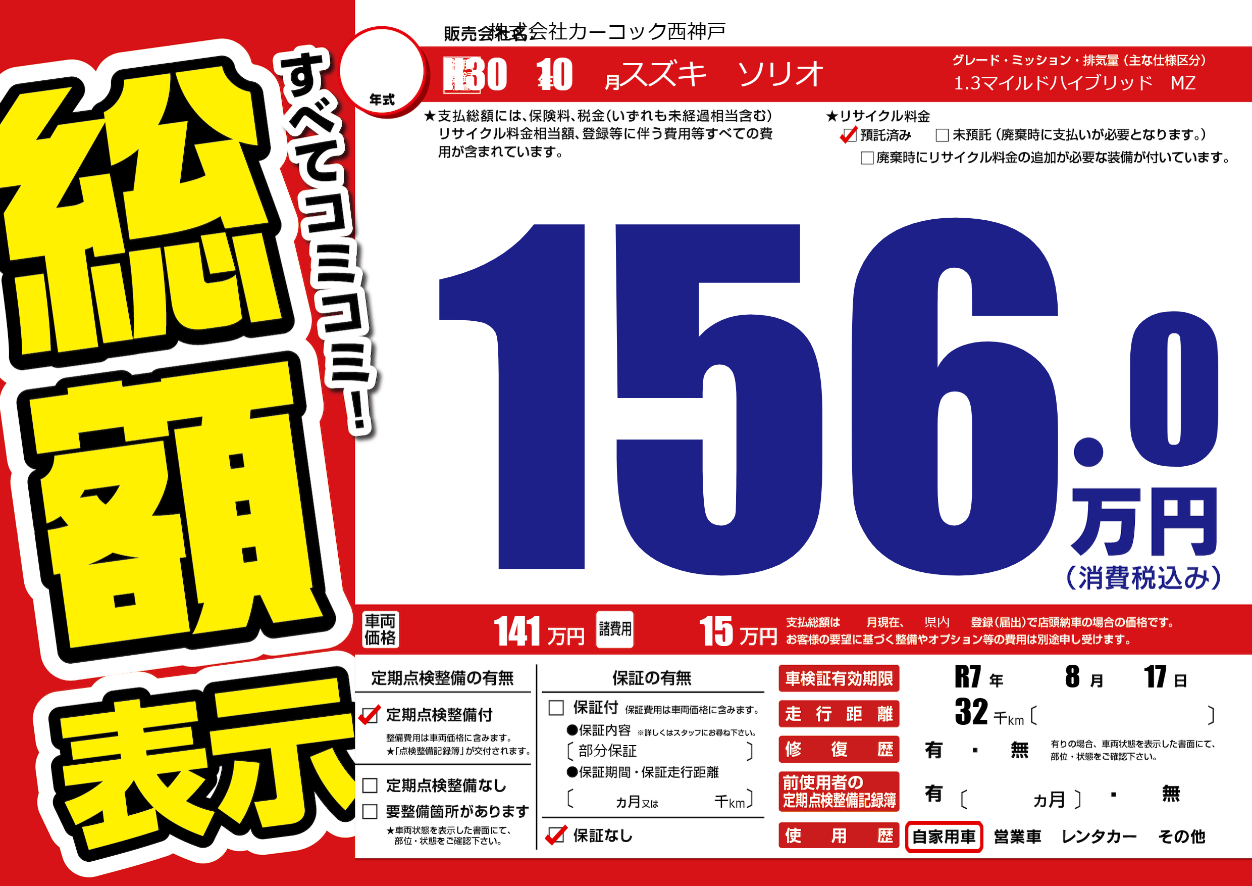 | 車名 | スズキ ソリオ | グレード ミッション 排気量 |
