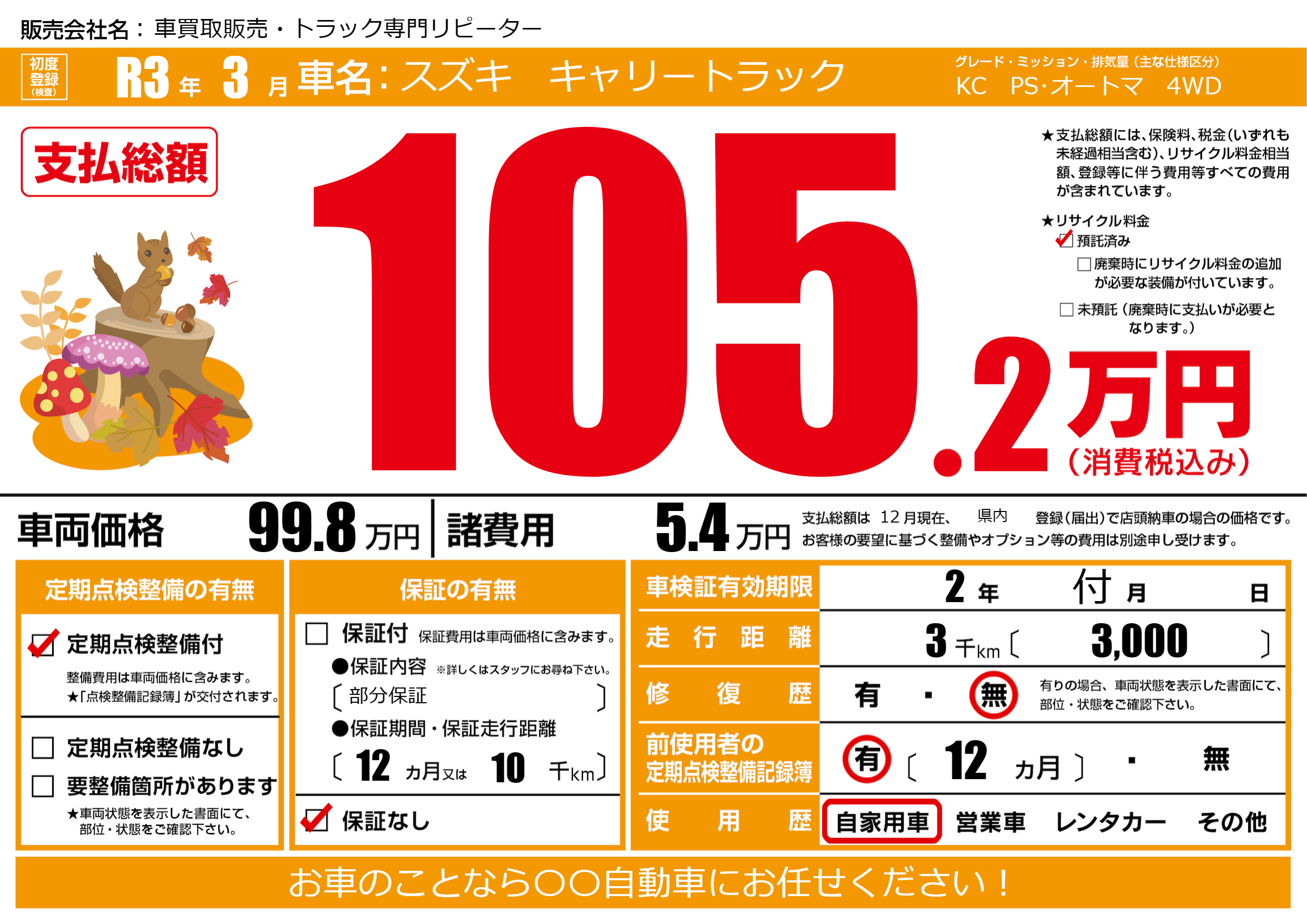 | 車名 | スズキ キャリートラック | グレード ミッション 排気量 |