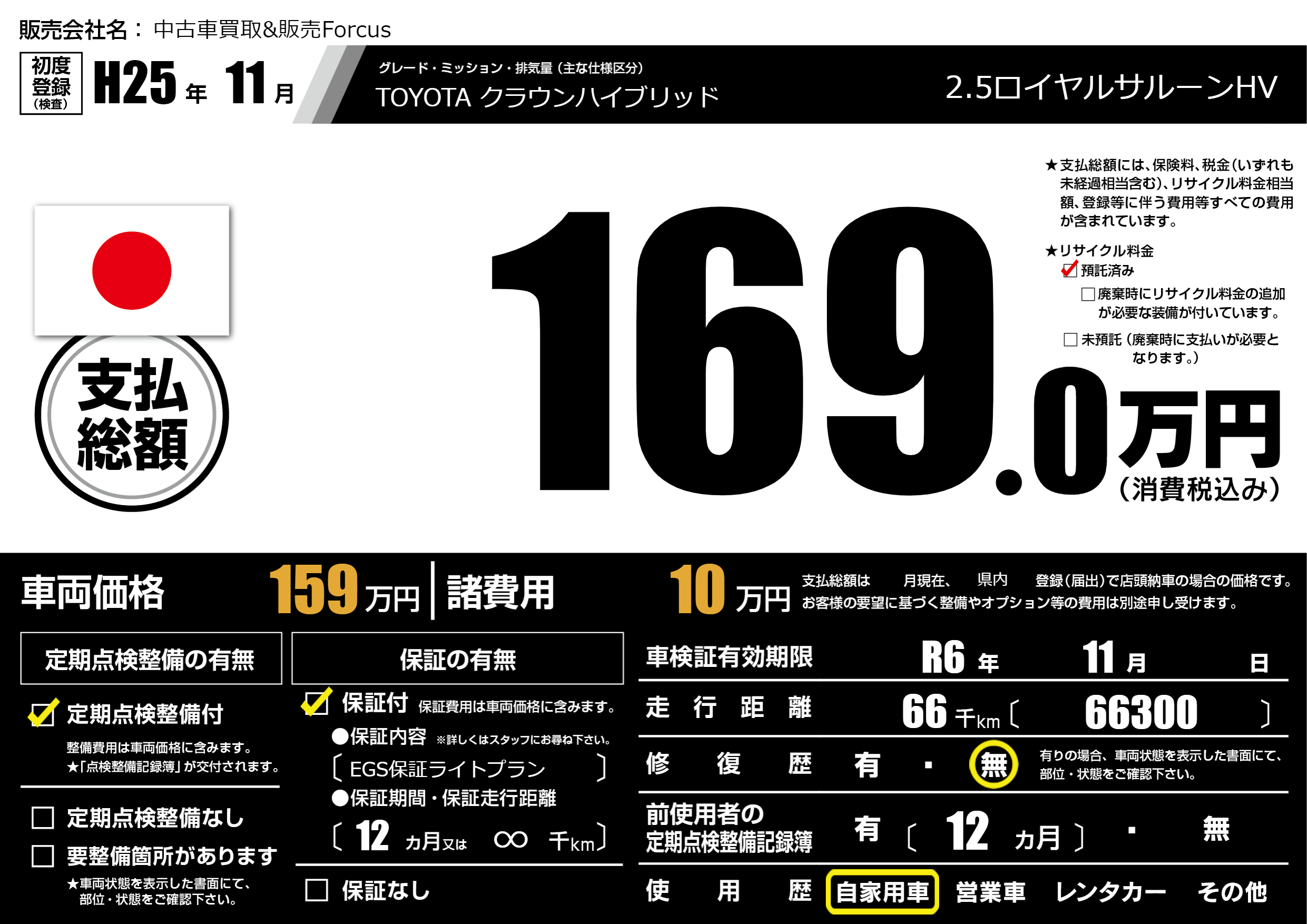 | 走行キロ | 6.6万km | 初年度登録 | H25年11月 |