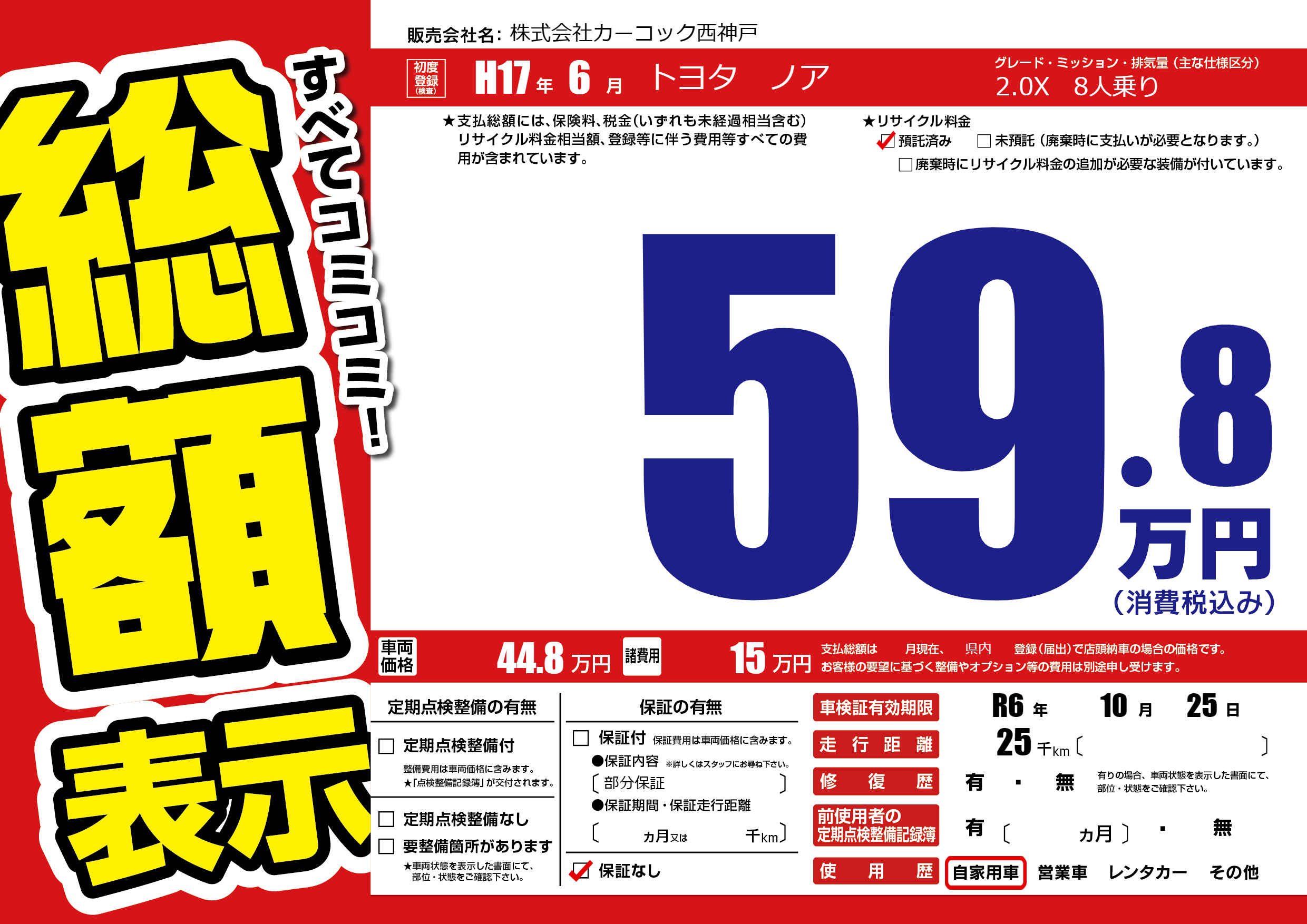 | 車名 | トヨタ ノア | グレード ミッション 排気量 |