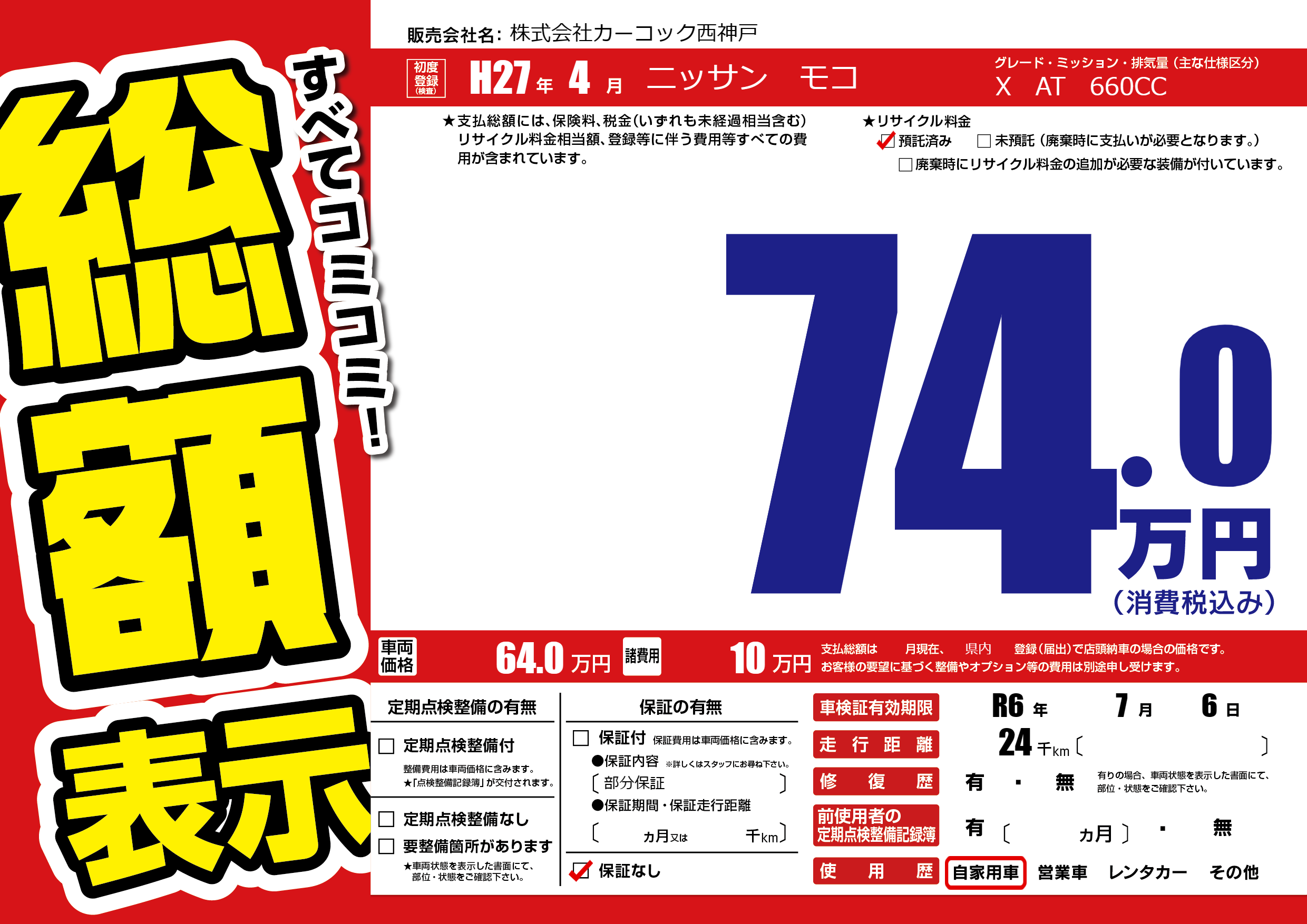 | 車名 | ニッサン モコ | グレード ミッション 排気量 |