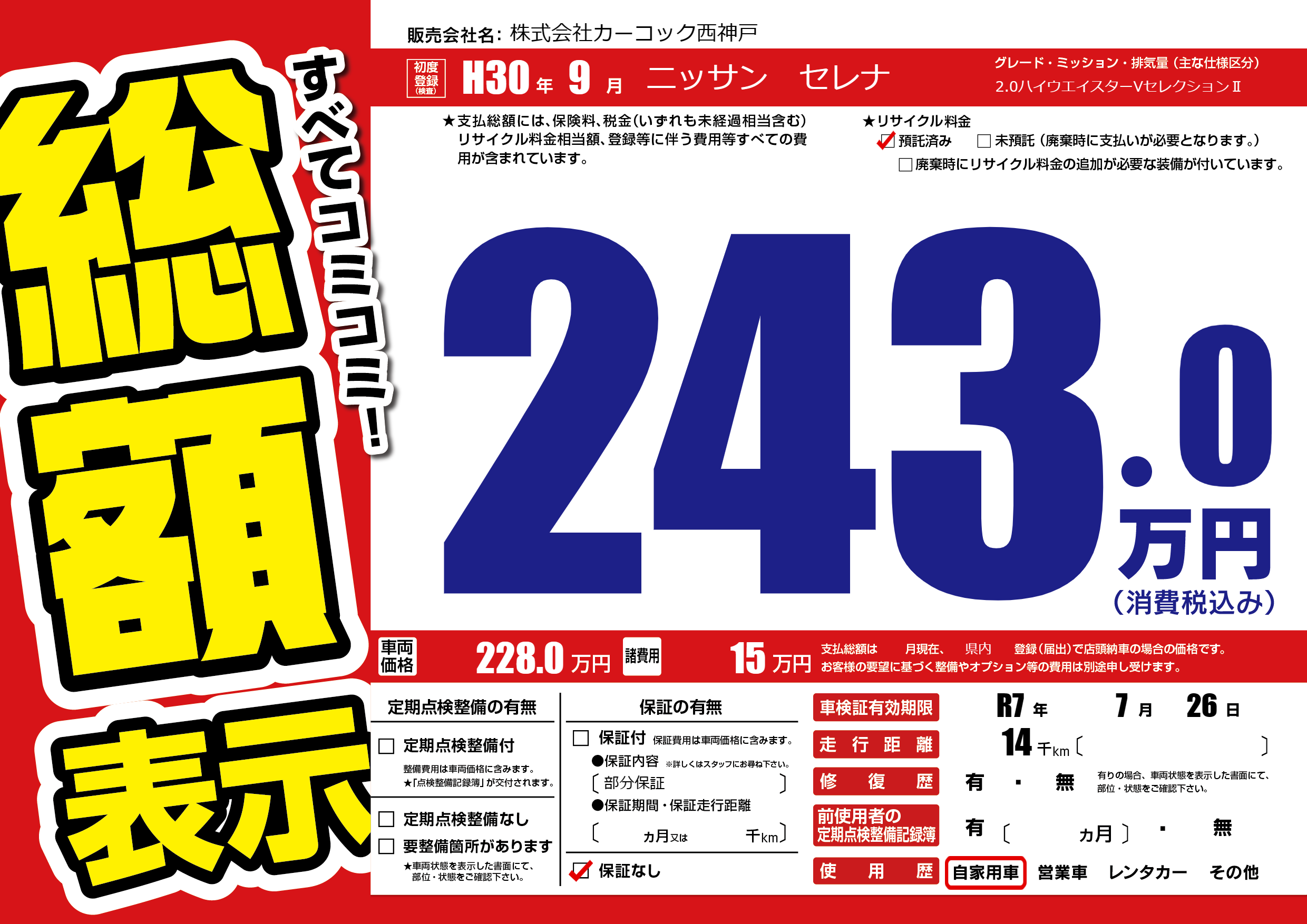 | 走行キロ | 1.4万km | 初年度登録 | H30年9月 |