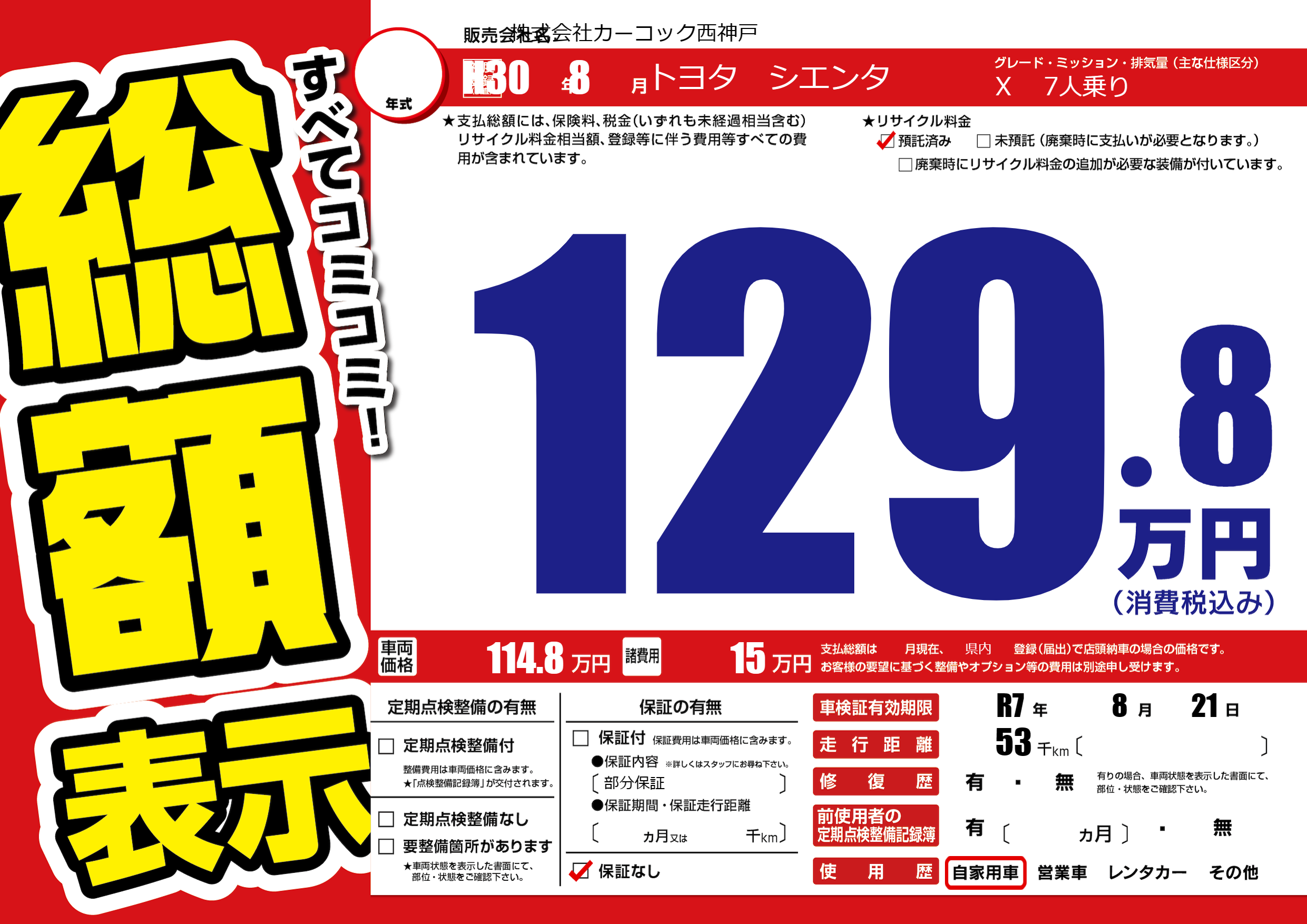 | 車名 | トヨタ シエンタ | グレード ミッション 排気量 |