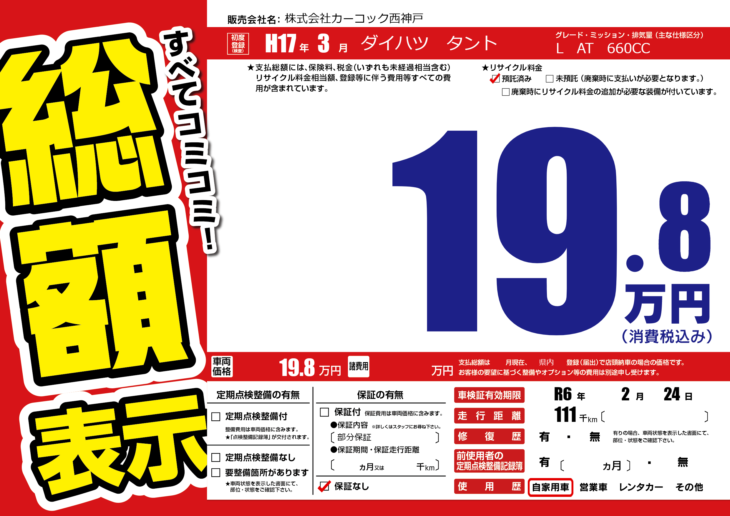 | 走行キロ | 11.1万km | 初年度登録 | H17年3月 |