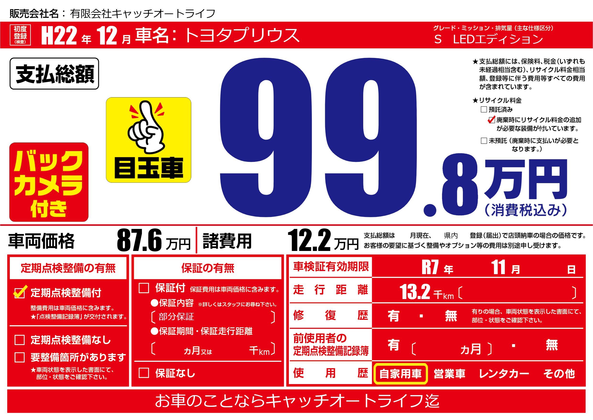 | 走行キロ | 1.3万km | 初年度登録 | H22年12月 |