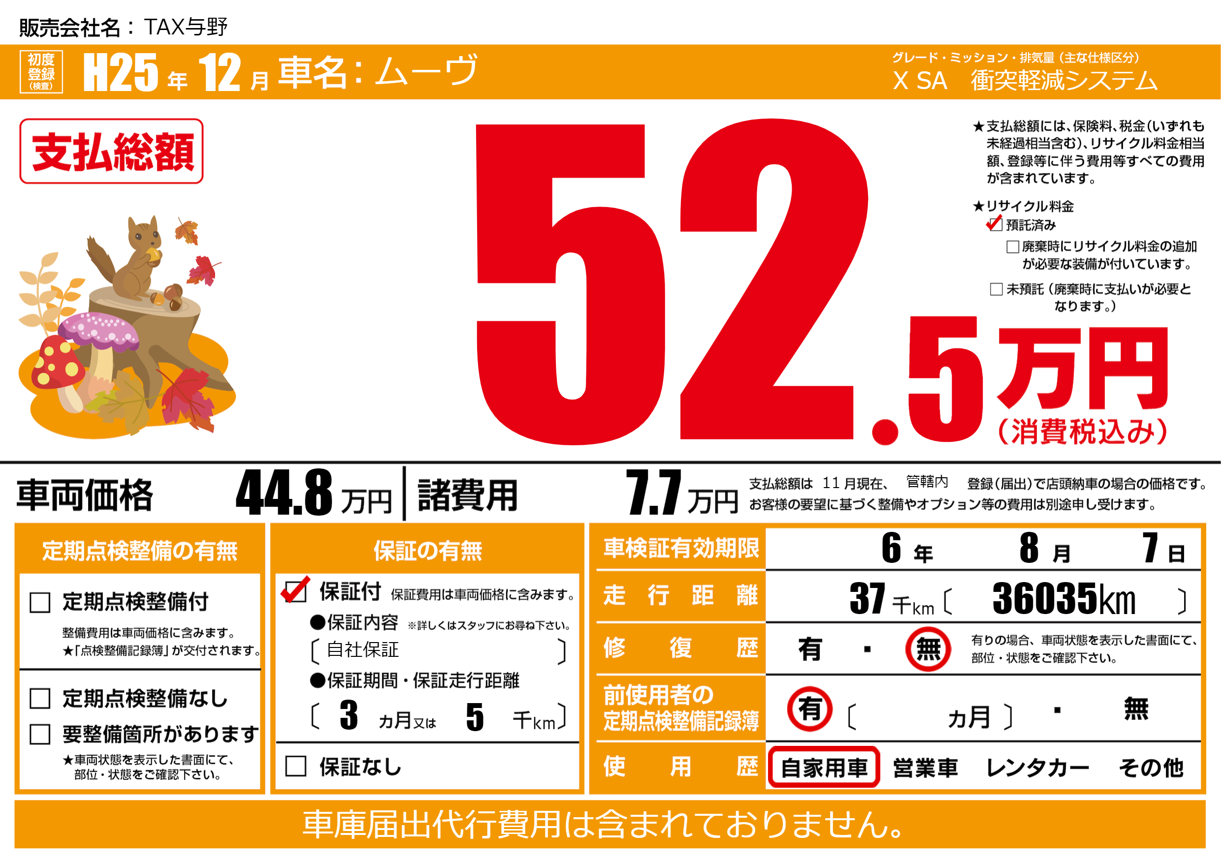 | 走行キロ | 3.7万km | 初年度登録 | H25年12月 |