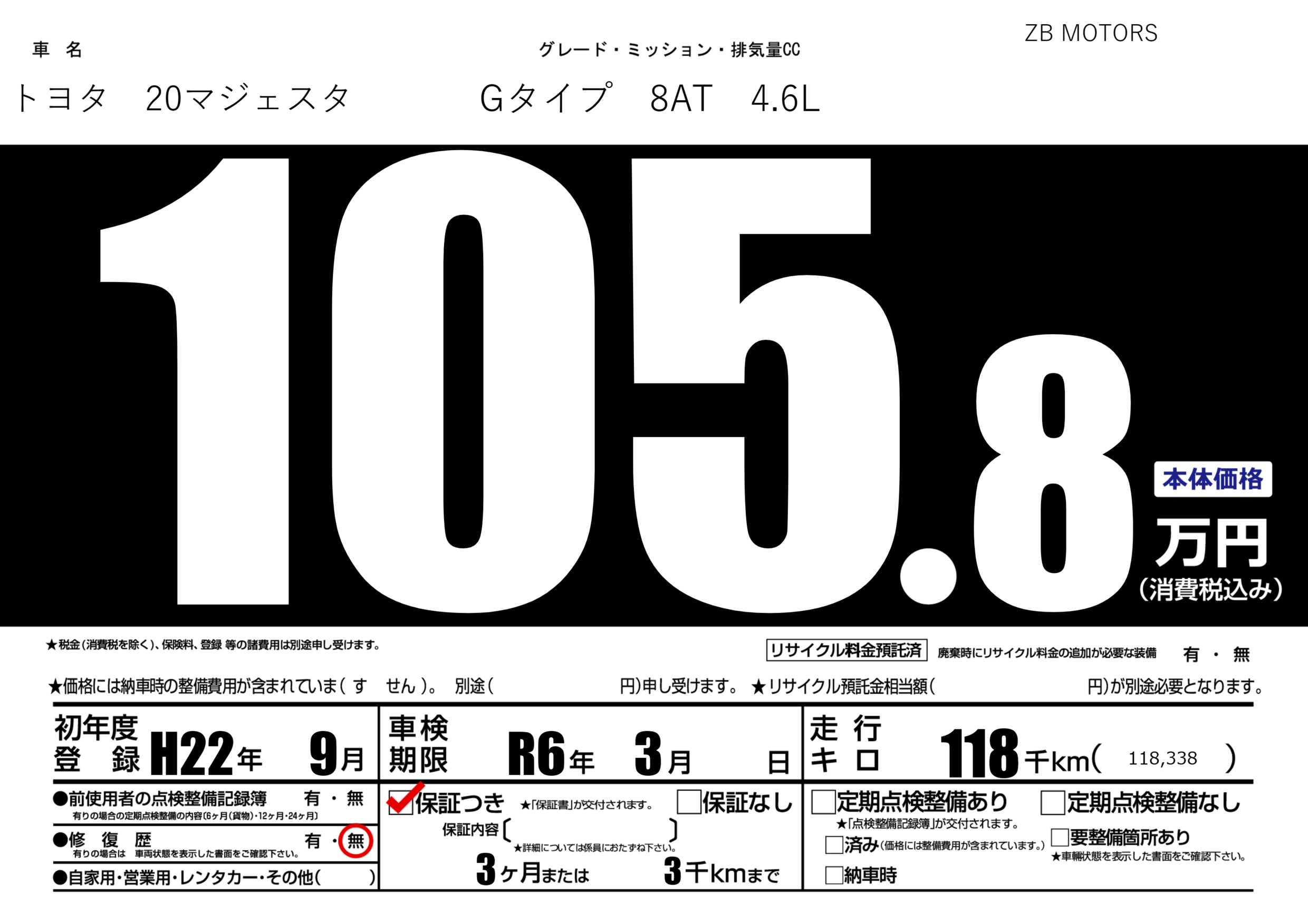 | 車名 | トヨタ 20マジェスタ | グレード ミッション 排気量 |