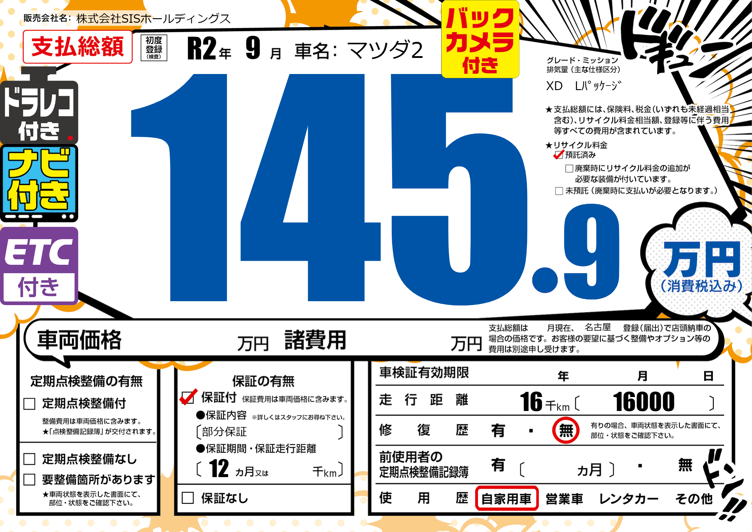 | 走行キロ | 1.6万km | 初年度登録 | R2年9月 |