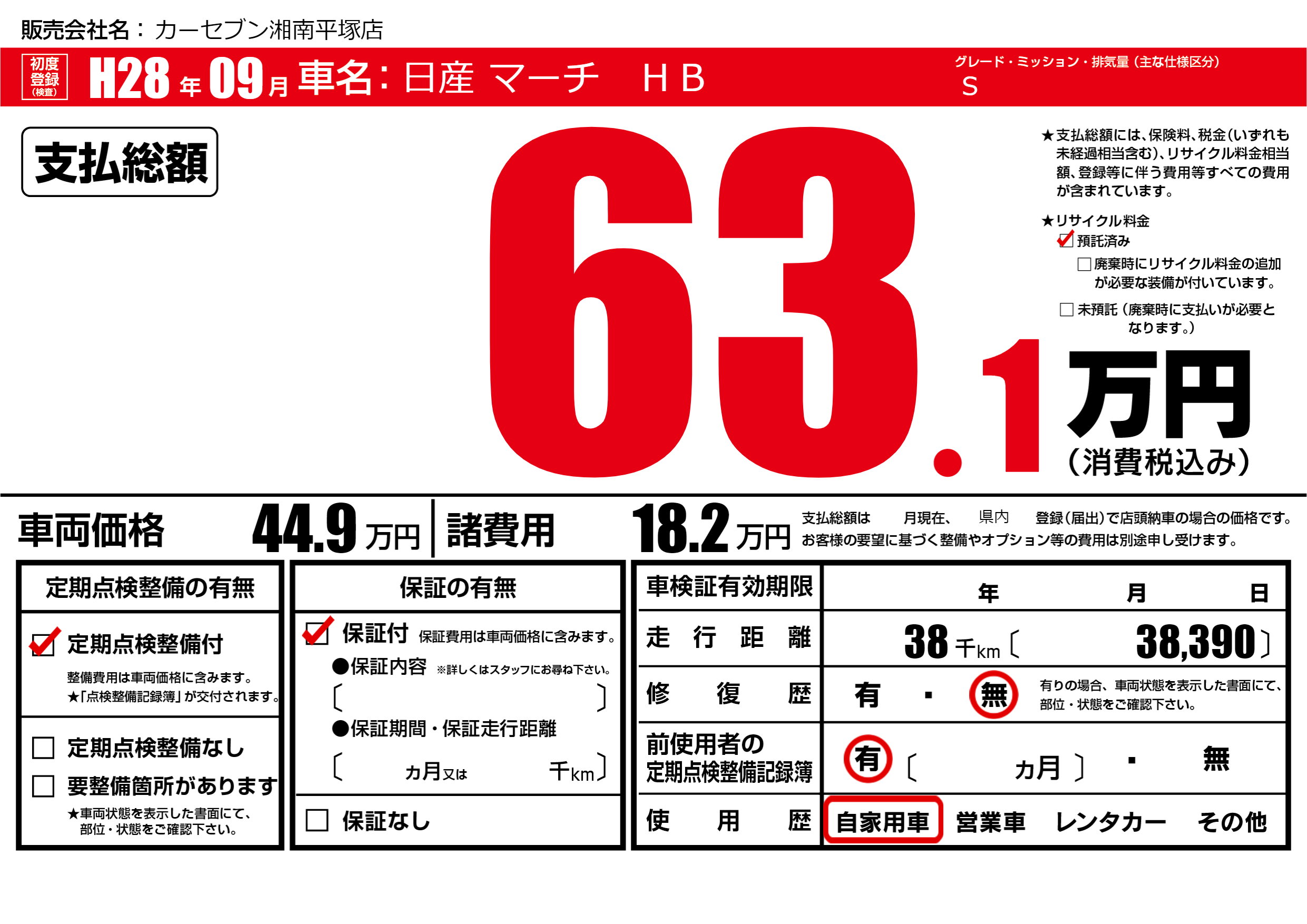 | 車名 | 日産 マーチ HB | グレード ミッション 排気量 |