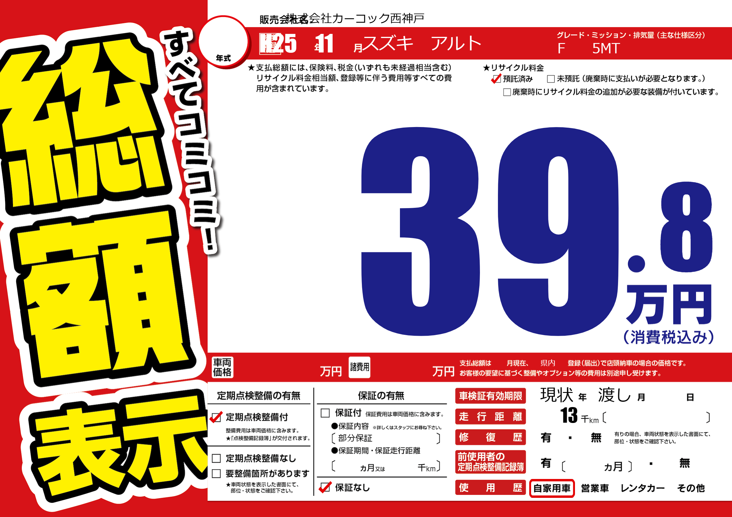 | 車名 | スズキ アルト | グレード ミッション 排気量 |