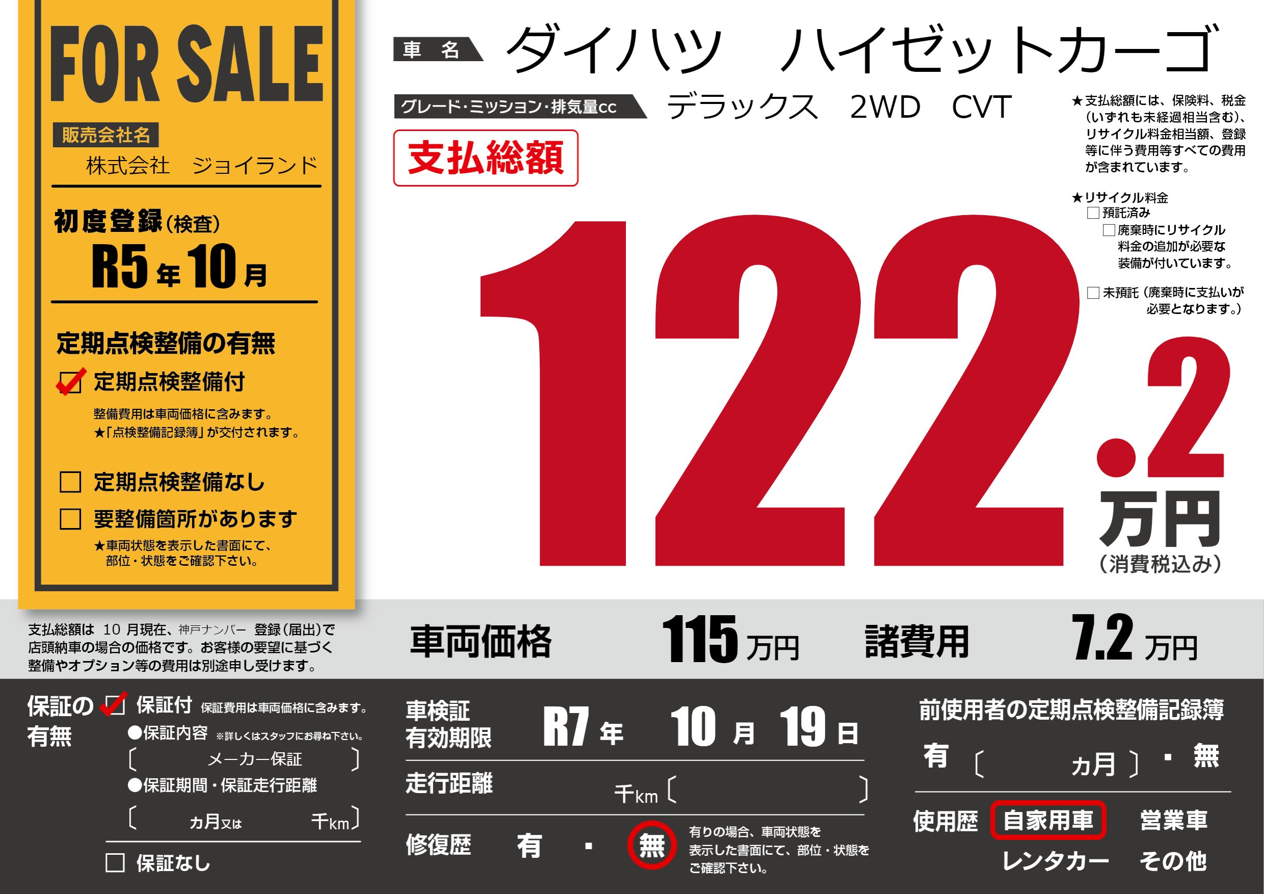 | 車名 | ダイハツ ハイゼットカーゴ | グレード ミッション 排気量 |