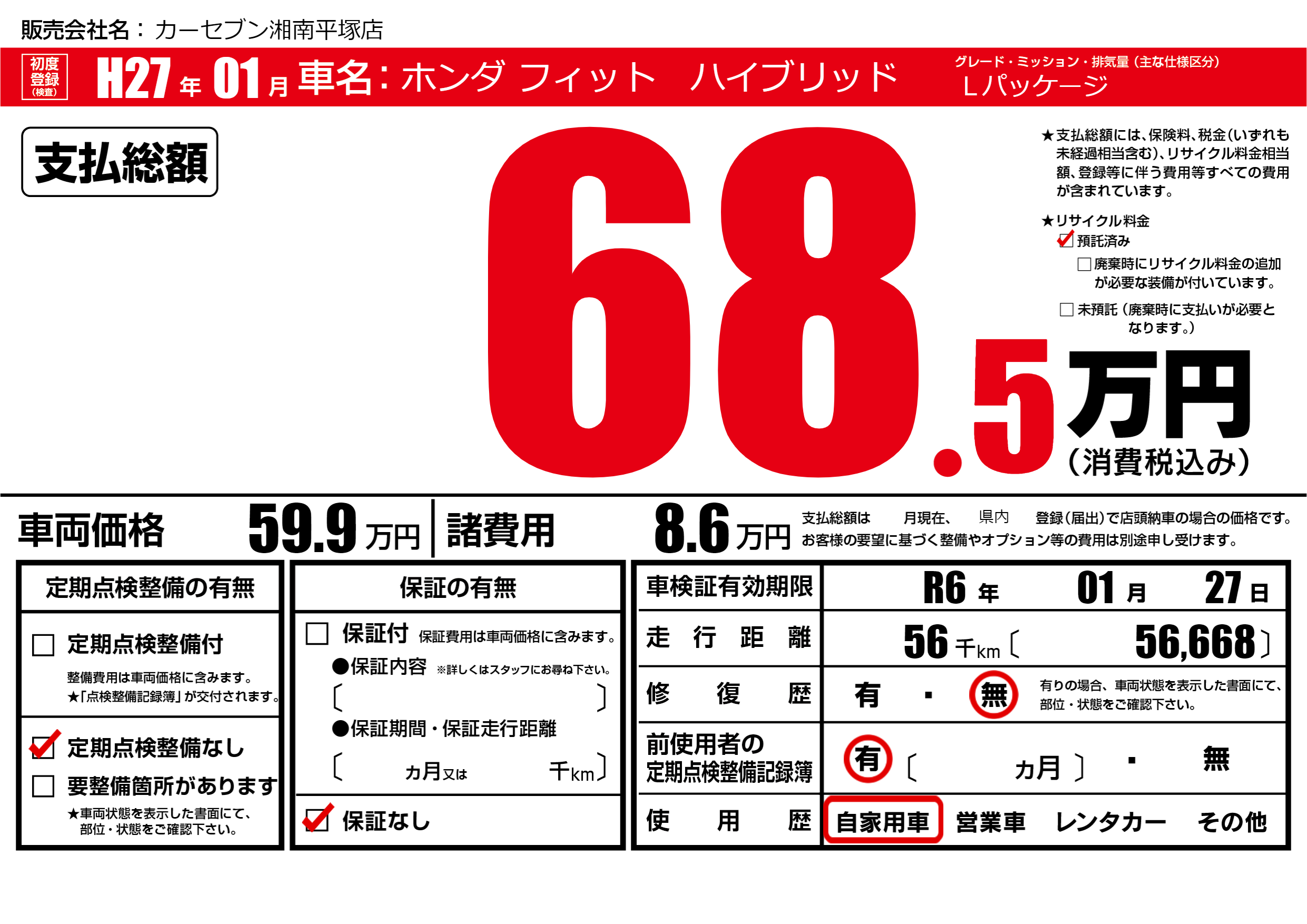 | 車検制限 | R6年 01月 27日 | ||