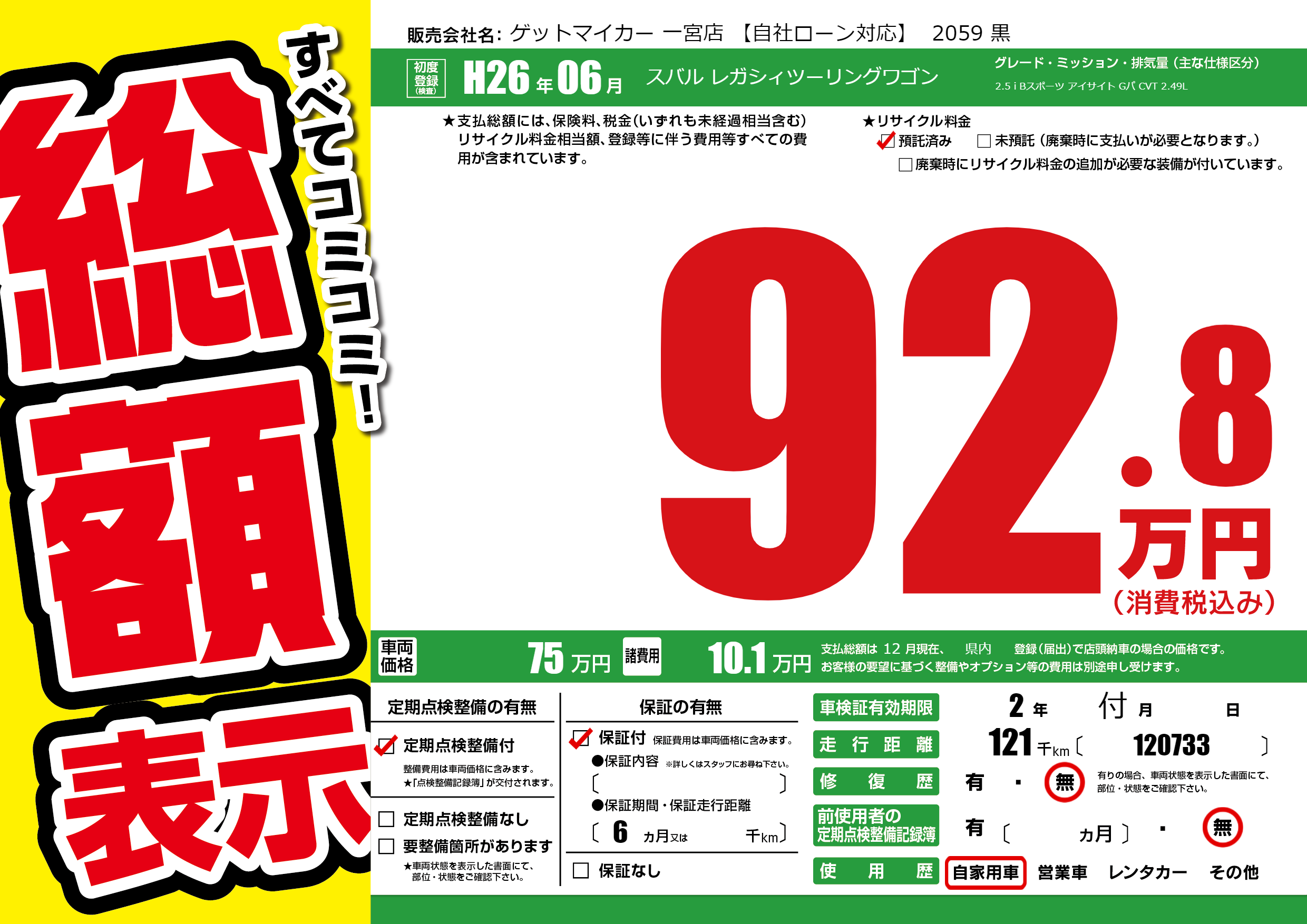 | 車名 | スバル レガシィツーリングワゴン | グレード ミッション 排気量 |