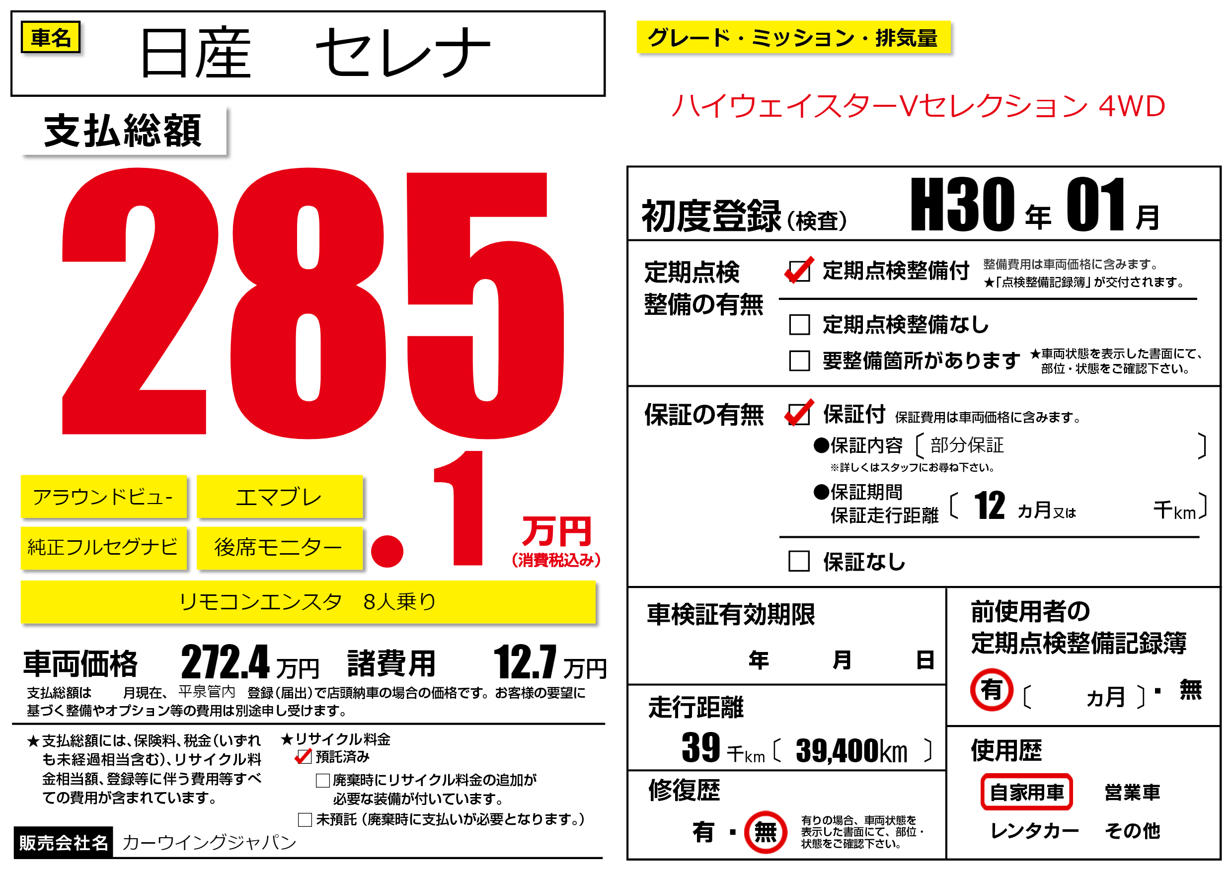 | 車名 | 日産 セレナ | グレード ミッション 排気量 |