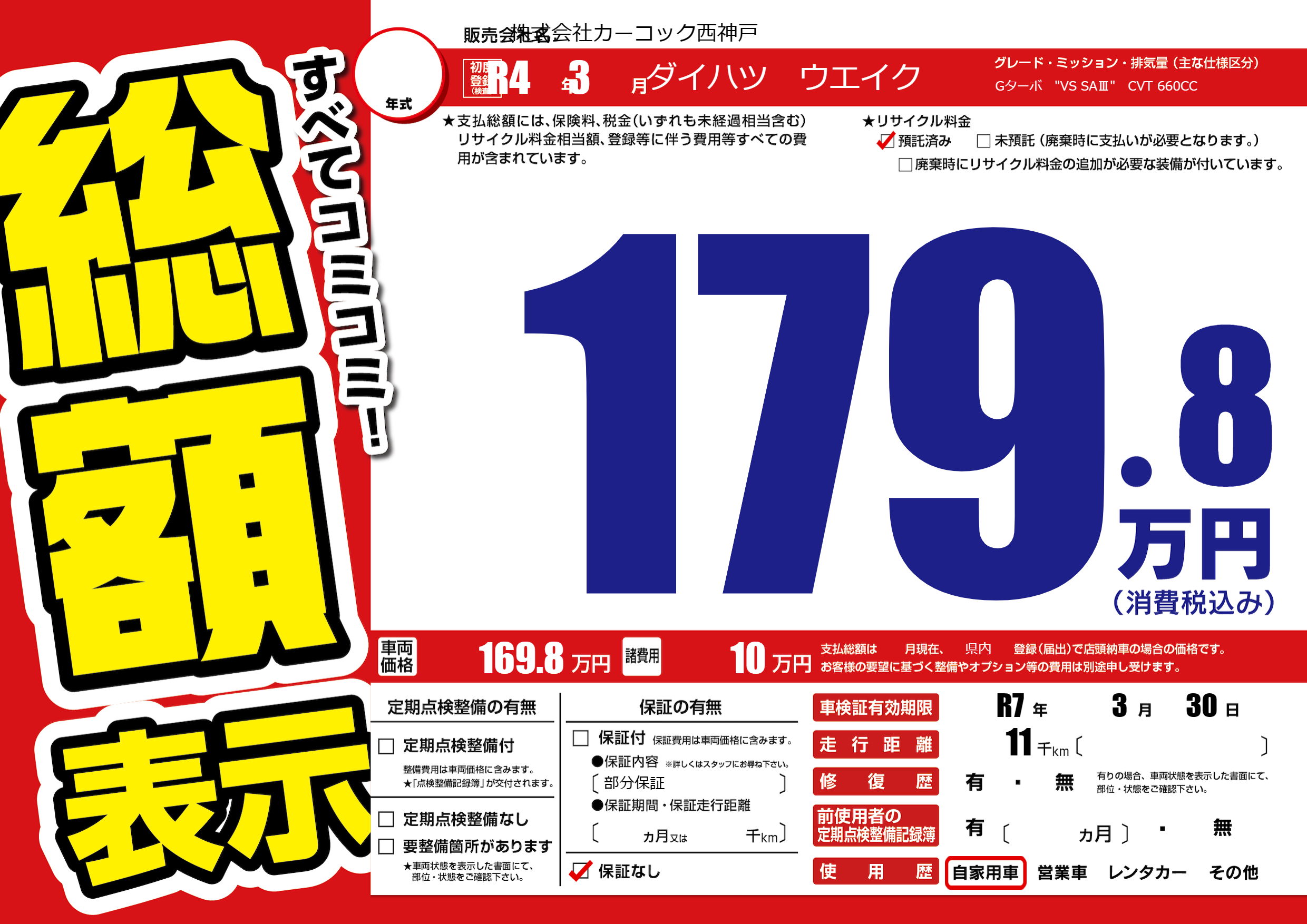 | 走行キロ | 1.1万km | 初年度登録 | R4年3月 |