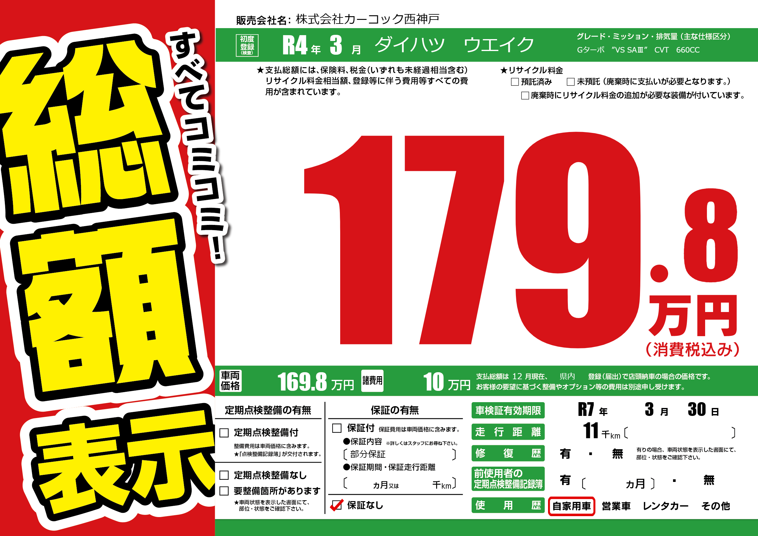 保証なし 保証内容(部分保証) ---ヶ月または()千kmまで |