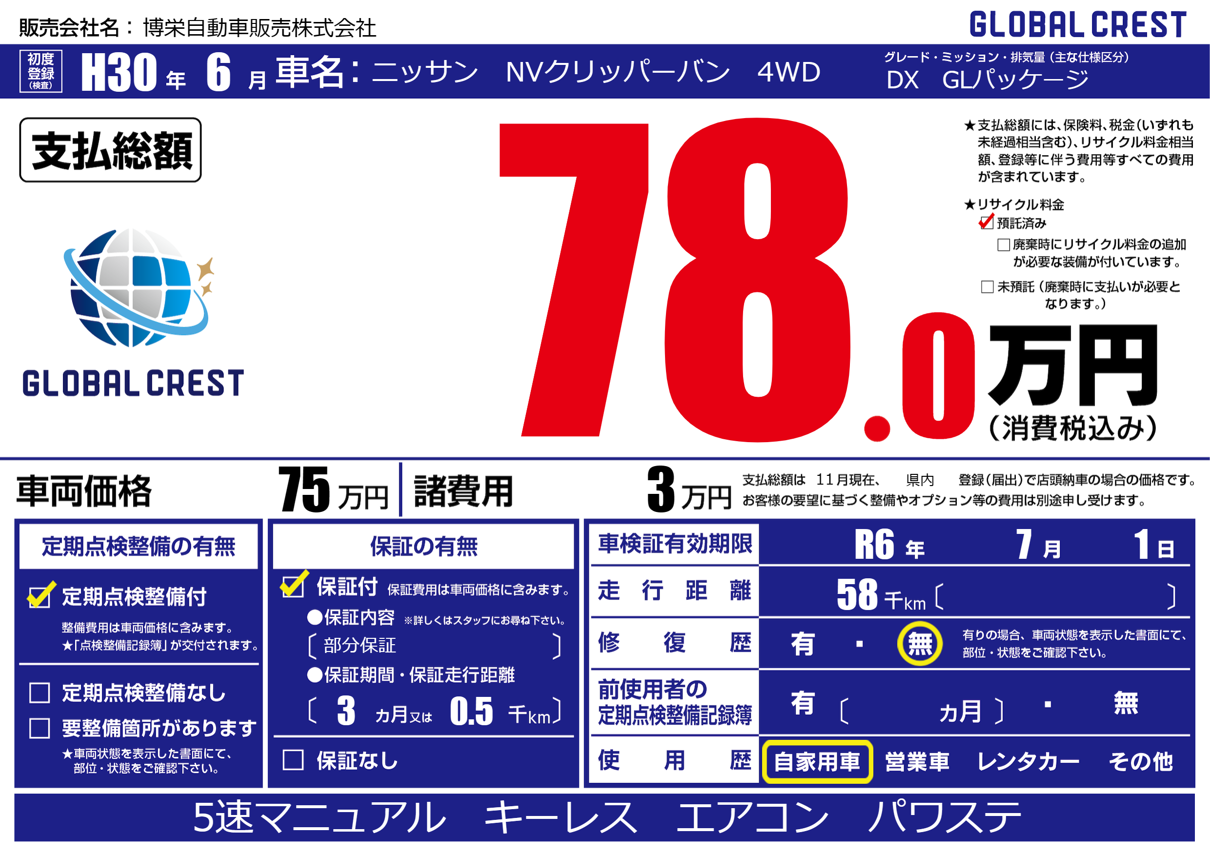 | 車検制限 | R6年 7月 1日 | ||