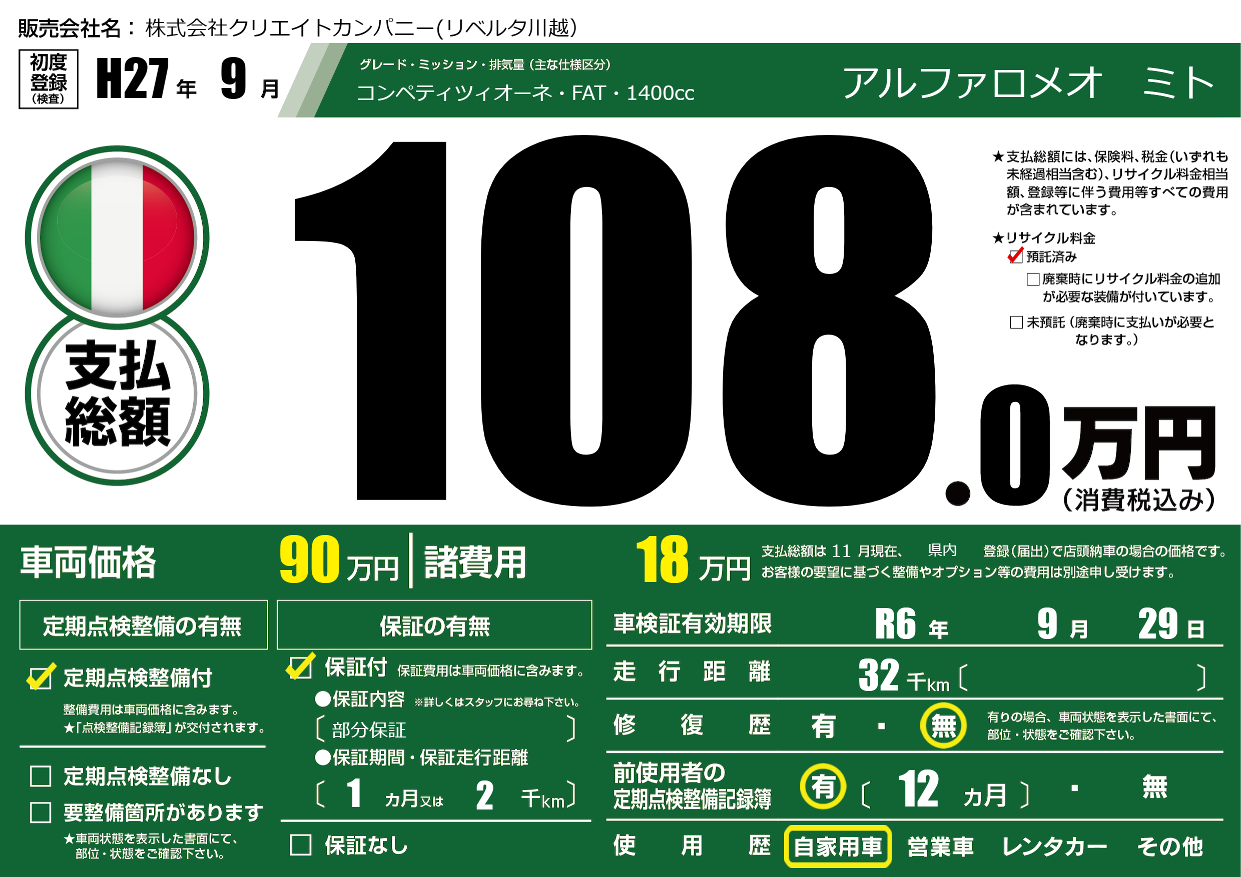 | 車名 | アルファロメオ ミト | グレード ミッション 排気量 |