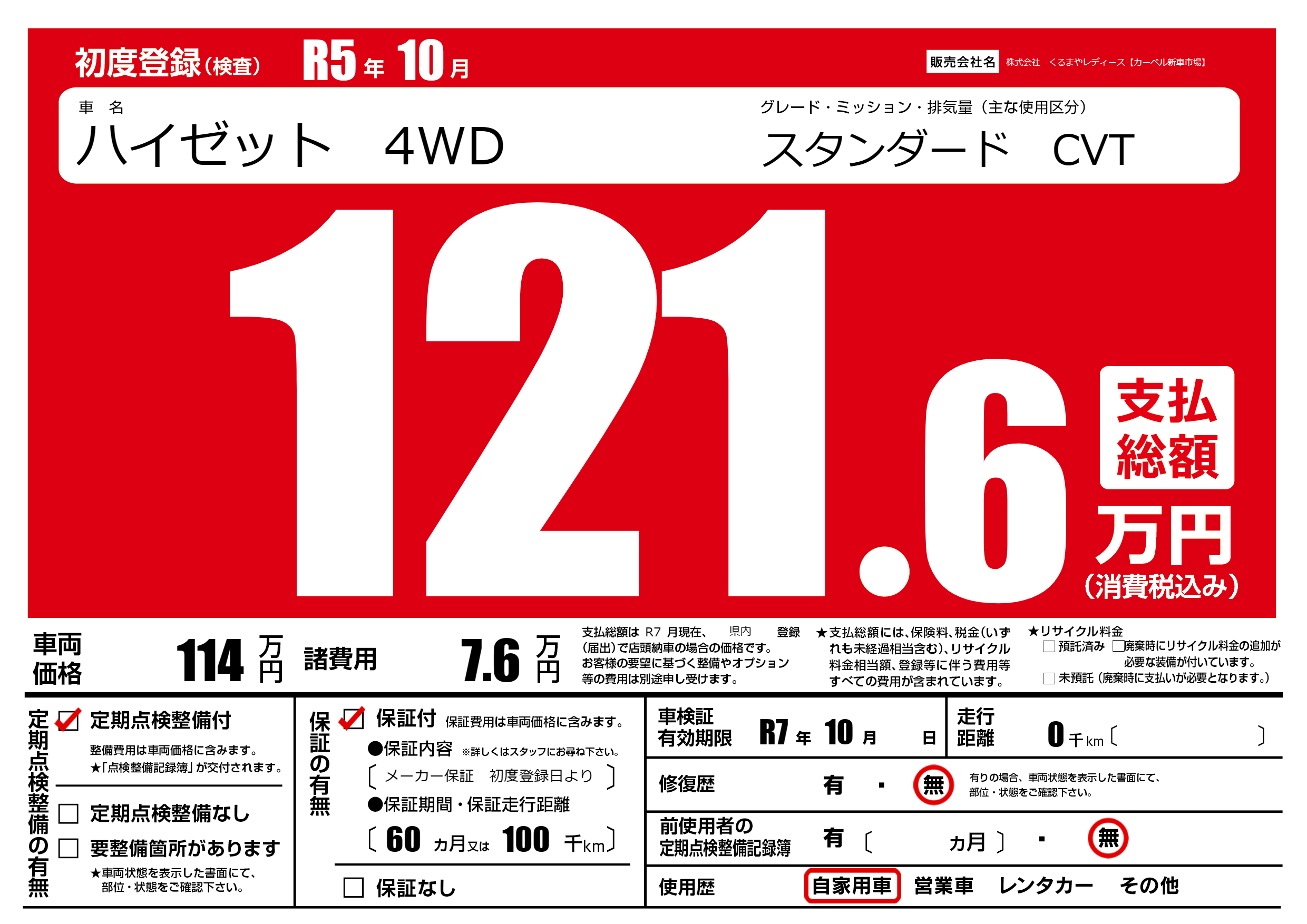 | 走行キロ | - | 初年度登録 | R5年10月 |