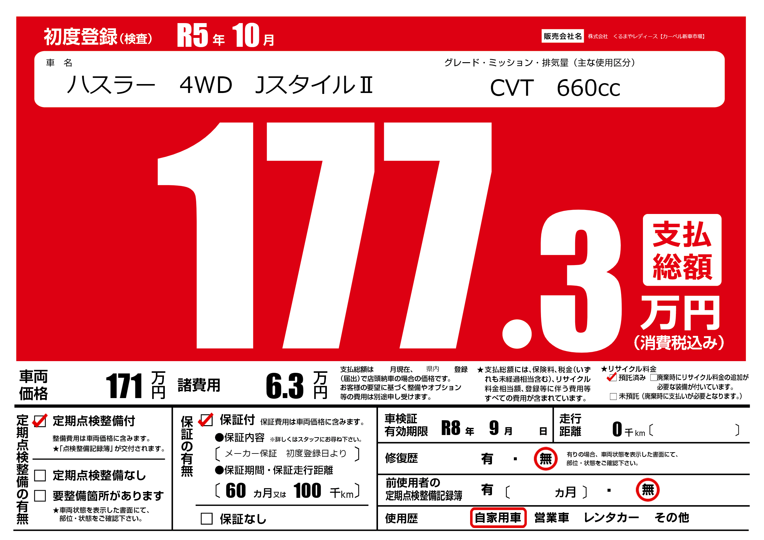 | 車名 | ハスラー 4WD JスタイルⅡ | グレード ミッション 排気量 |