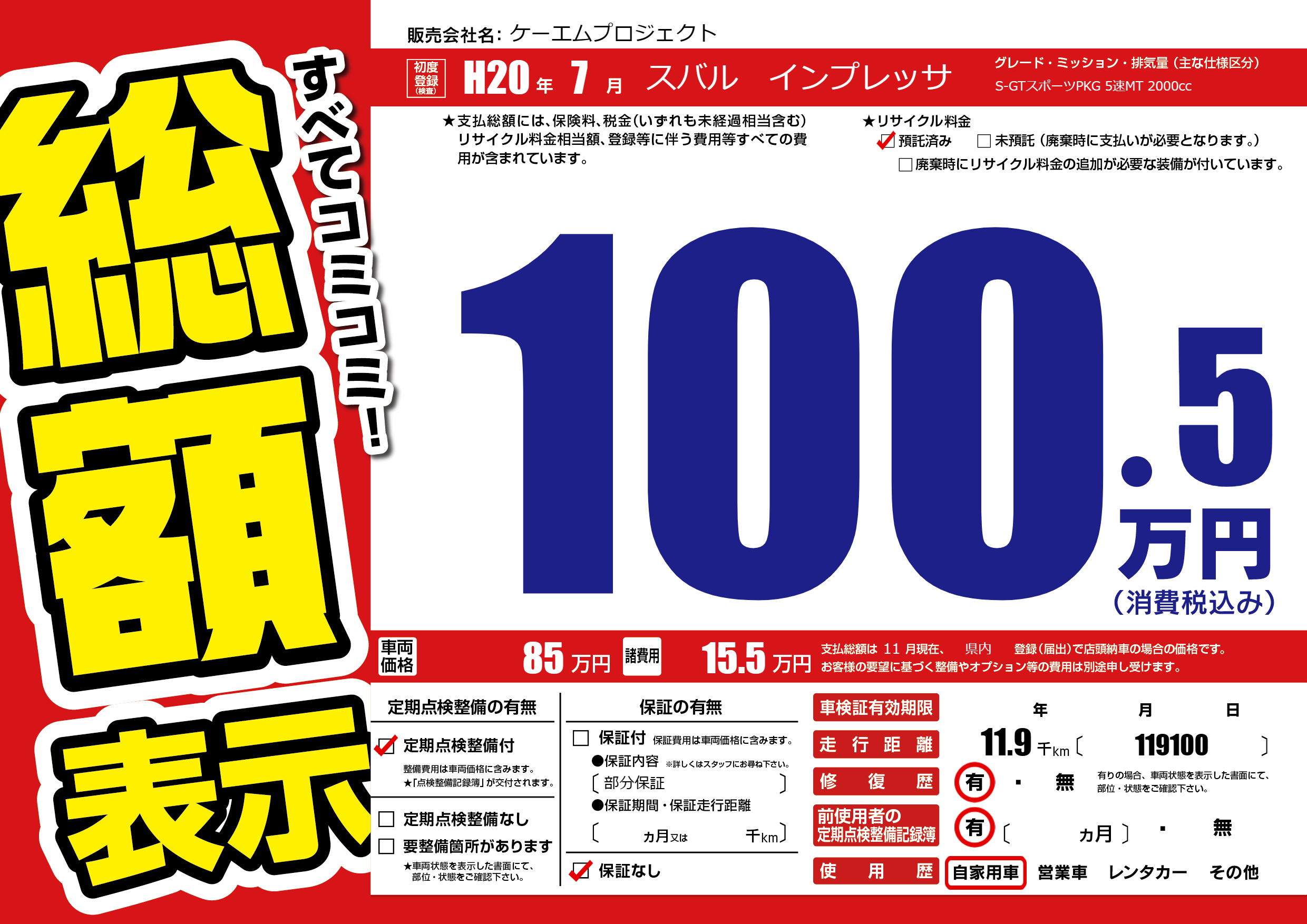 | 車名 | スバル インプレッサ | グレード ミッション 排気量 |