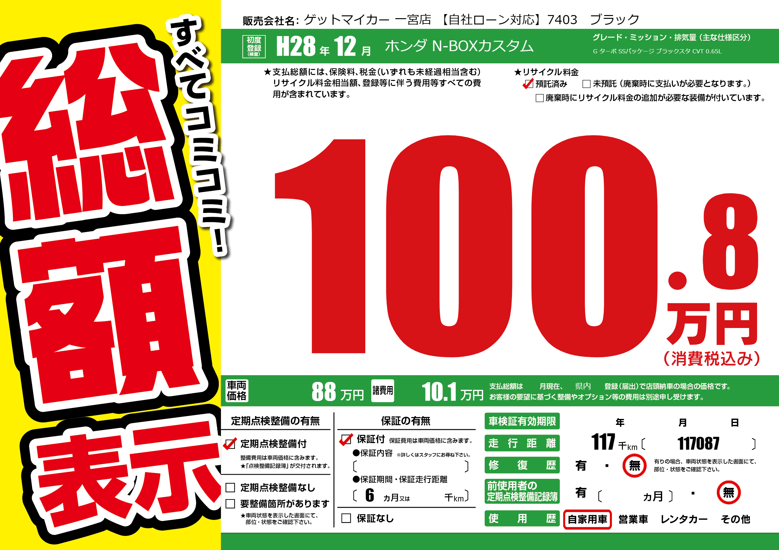 | 車名 | ホンダ N-BOXカスタム | グレード ミッション 排気量 |