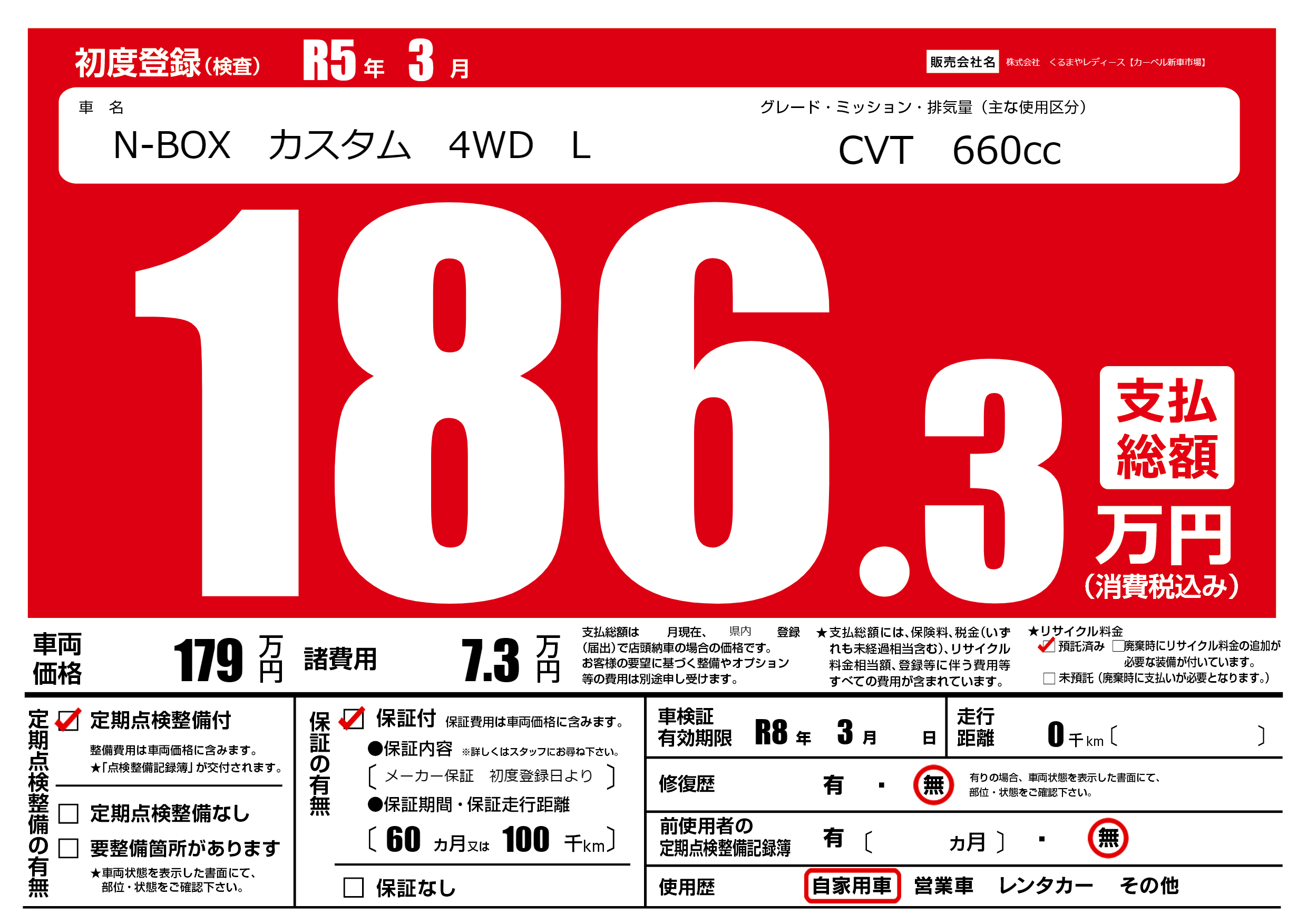 | 車名 | N-BOX カスタム 4WD L | グレード ミッション 排気量 |