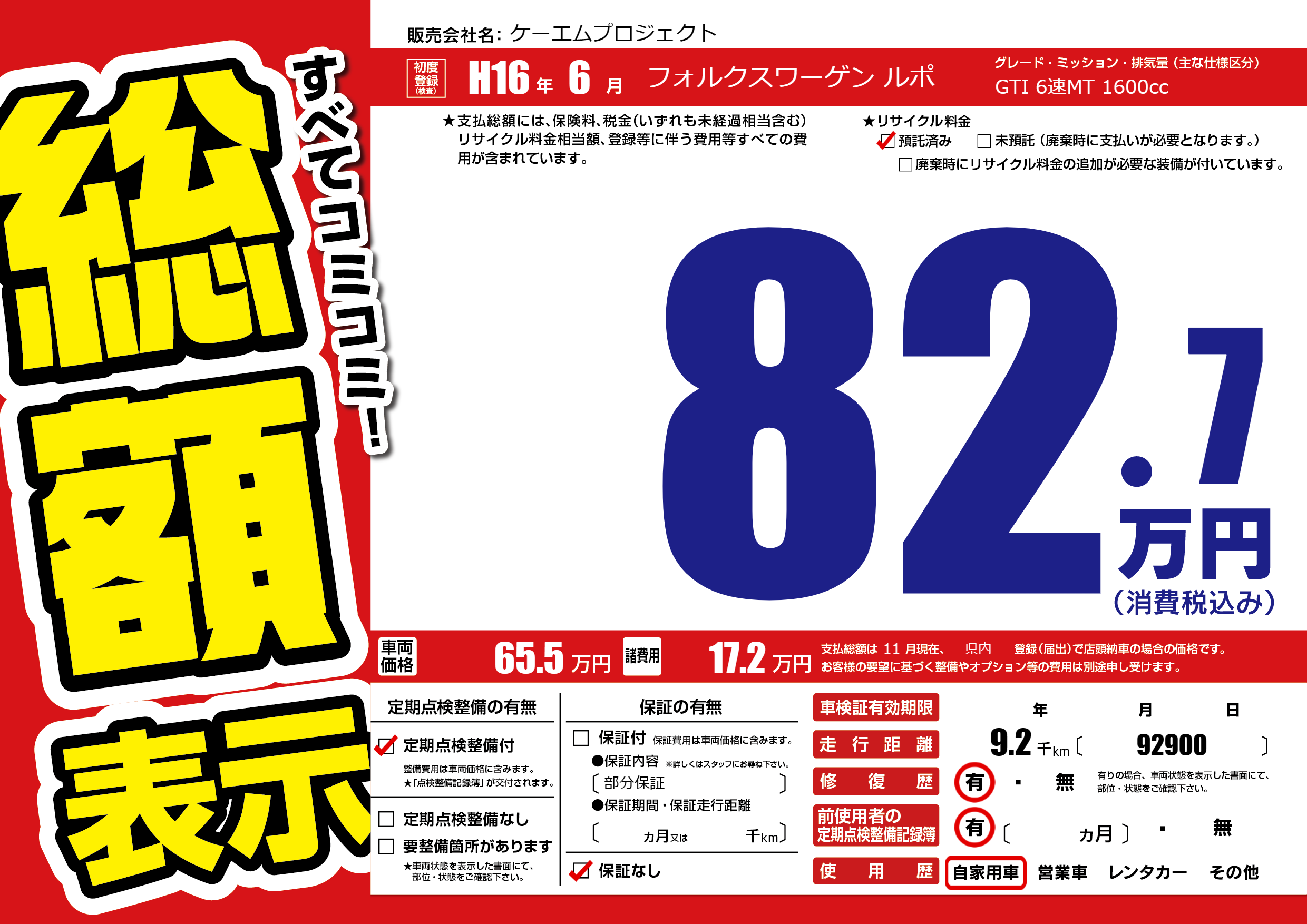 | 車名 | フォルクスワーゲン ルポ | グレード ミッション 排気量 |