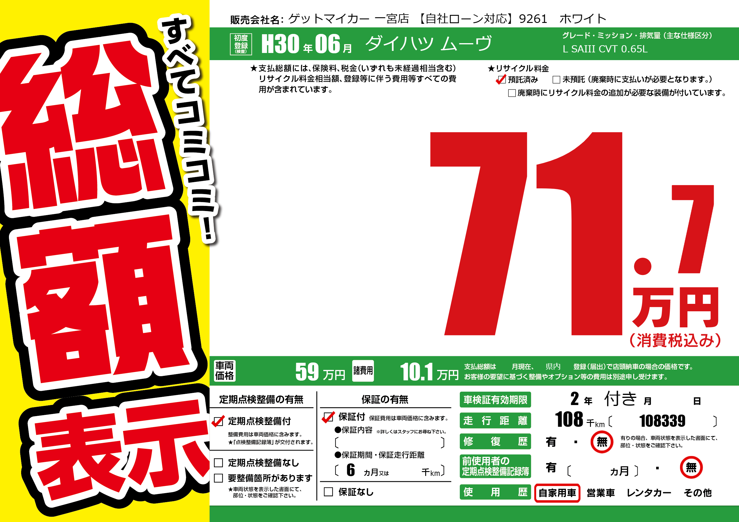 | 走行キロ | 10.8万km | 初年度登録 | H30年06月 |